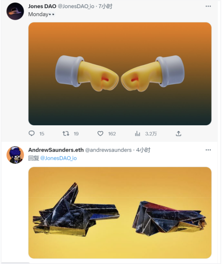 多个主流 DeFi 项目同时发布“碰拳”图片,或有重要消息包括 MakerDAO、SushiSwap、Balancer 在内的多个主流 DeFi 项目官推于今日同时发布各具项目特有配色背景的“碰拳”图片。DeFi 杠杆协议 Gearbox Protocol 发文解释称,“如果你对此感到困惑,这只是我们与其他 DeFi 项目一起进行的一次 DAO 快闪行为(DAO flashmob),也可以说是一次协作的尝试,但市场贡献者可以为星期一准备一些很酷的东西”。情报来源:https://twitter.com/GearboxProtocol/status/1621584305930510336
