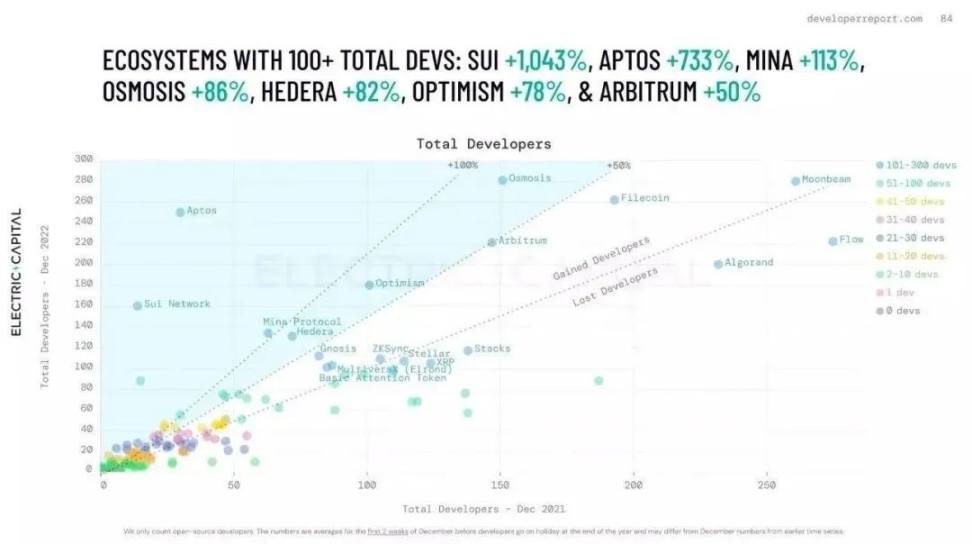 根据 ElectricCapital 的年度报告,Mina 生态每月有 145 个活跃的开发者。比去年增长了 96%,使 Mina 跻身开发者总数前 30 名的项目之列。