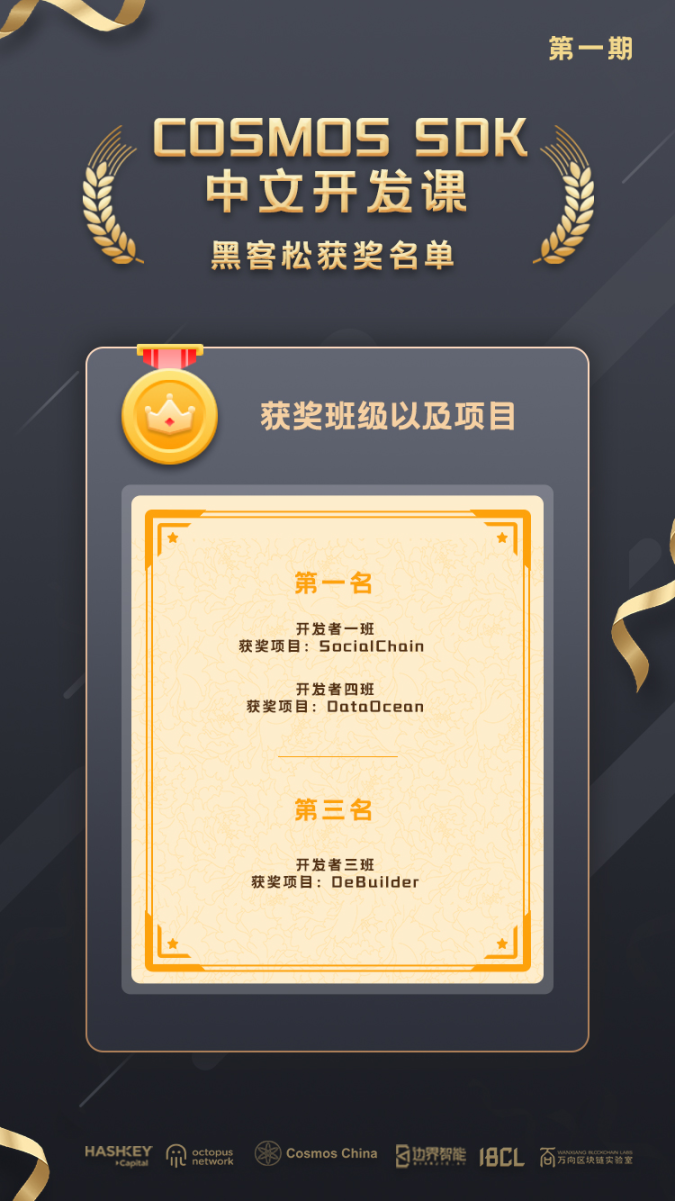 由 HashKey Capital、章鱼网络、边界智能、Cosmos 中文社区、IBCL 社区、万向区块链实验室联合主办的 Cosmos SDK 中文开发课第一期,于 2023 年 1 月 12 日顺利结业。