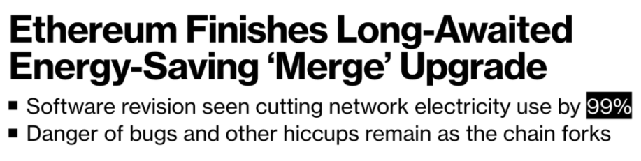 Frank:主流媒体包括以太坊社区的人都说:“Merge 最大的意义在于以太坊网络的的电力 / 能源消耗,让整个以太坊的网络变得更加环保。”好像以太坊是为了环保才去做这次 Merge 升级似的。我昨天还去看了一下最代表专业主流媒体的 Bloomberg 对于以太坊 Merge 的报道,该报道的标题就是 ——“以太坊完成了期待已久的节约能源的升级”。