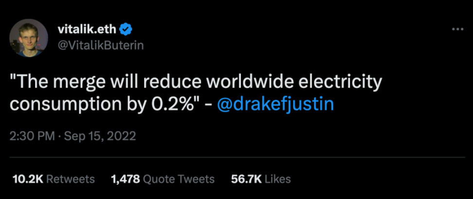 Merge 升级完成后,Vitalik 也发过一条 Twitter:“Merge 减少了全球 0.2% 的电力消耗。”