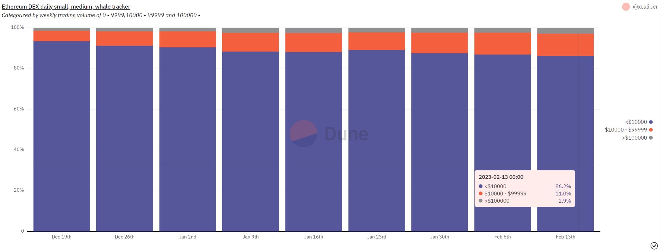 与上两周相比,近两周 ETH 上的大规模交易、中规模交易和小规模交易的比例变化不大。