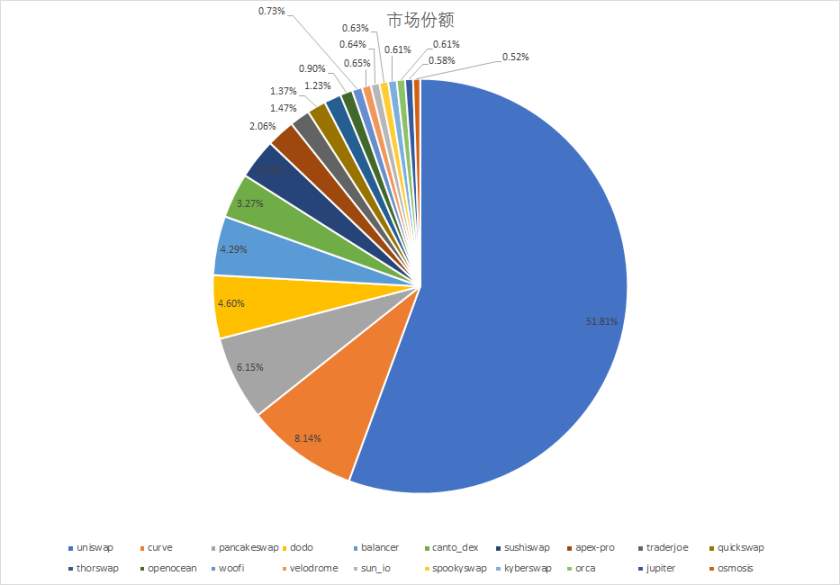 市场份额方面,前三位的 DEX 分别是:Uniswap、Curve、Pancakeswap。Uniswap 的市场份额有所下降;Curve 保持第二位;Pancakeswap 保持第三位;DODO 保持第四位,Balancer 上升至第五位。其他表现较好的交易所有 Canto DEX,Sushiswap 等。