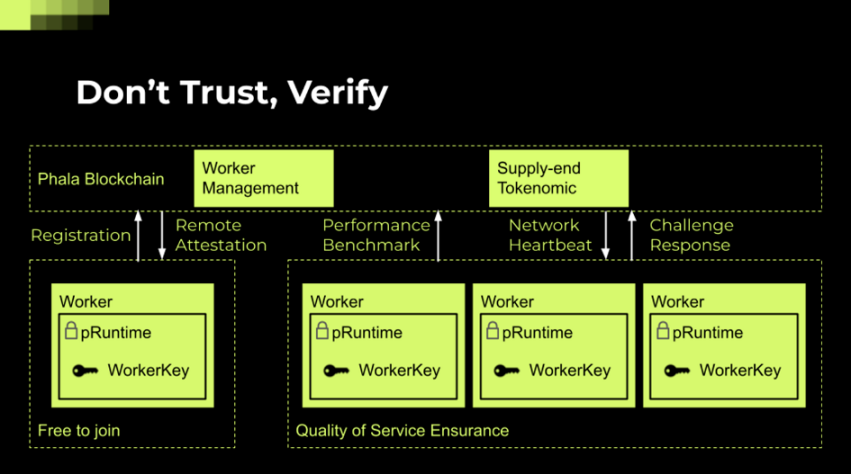 Phala 遵循“不相信,要核实”原则,并在其注册过程中应用远程认证过程。也就是说,需要 pRuntime 来生成由受信任硬件直接提供并由硬件制造商(在本例中为 Intel)认证的 RA Quotes[4]。该报告包含有关硬件和软件的重要信息:有了所有这些信息,我们就可以验证受信任的硬件和在其中运行的程序。此外,RA Quotes 和置信度度量使我们能够评估每个 Worker 的安全级别,并根据允许加入网络的硬件定制我们的安全策略。[4]:Intel 硬件中 SGX 的 RA Quotes 是在确保应用程序和数据安全性时使用的一种机制。其中 RA 是指“可信度验证”,Quotes 是指“引用证明”。所以 RA Quotes 就是在确定应用程序和数据是可信的时使用的证明。SGX 提供了一个称为“受保护的区域”的特殊环境,应用程序和数据可以在这个环境中运行和存储。然后,SGX 通过硬件证明机制来验证受保护区域中运行的应用程序和存储的数据是否符合可信度要求,而 RA Quotes 则是将这种可信度度量结合起来确认应用程序和数据的可信度。通过这种机制,可以确保应用程序和数据在受保护的区域中运行和存储是安全可信的。