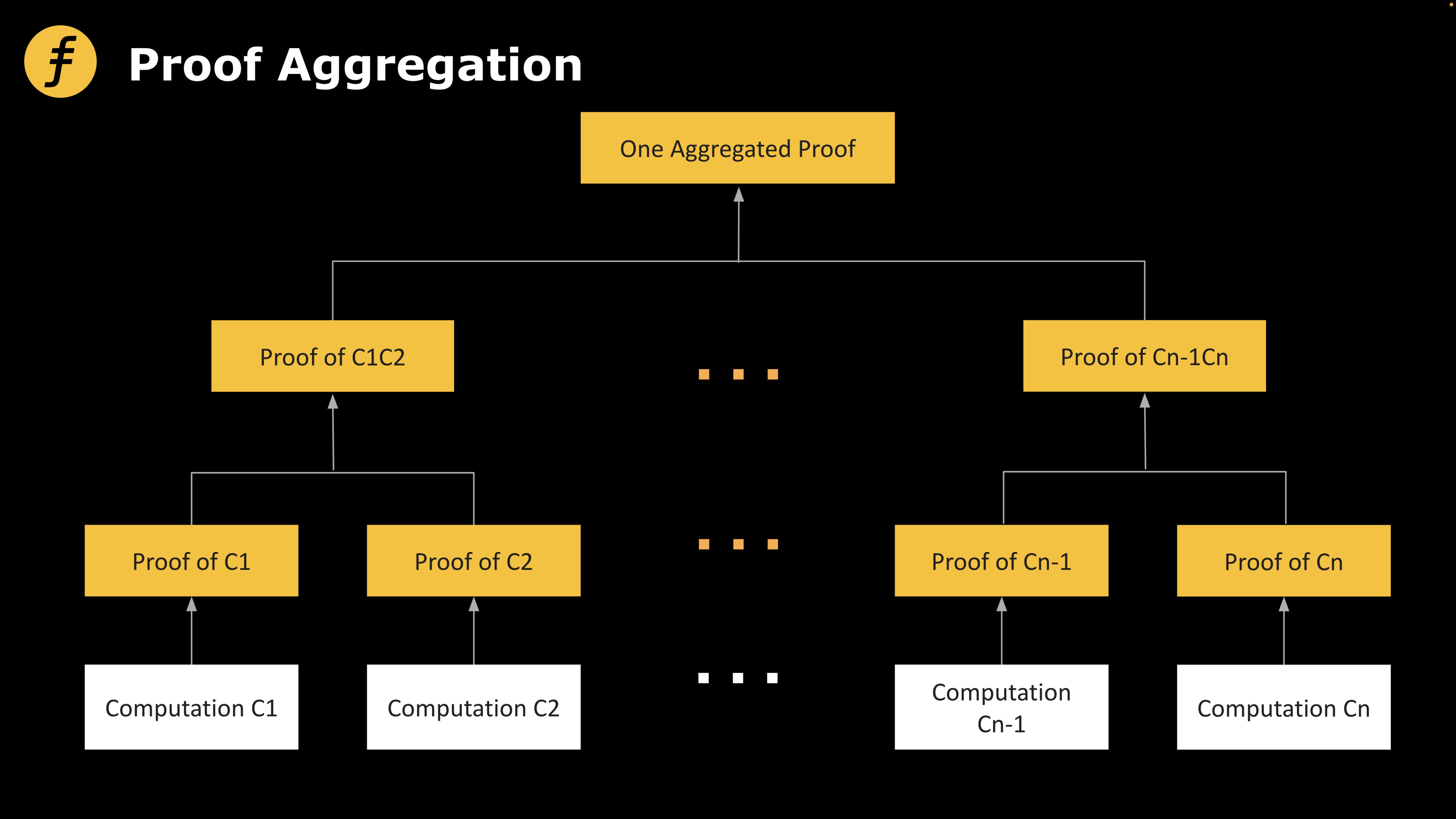 上面例子里把 7 张照片直接放入一个信封就是直观意义上的证明聚合,这在实际情况中对应的是将不同证明连接在一起并依次线性验证,即先验证第一个证明,再验证第二个证明以及随后的证明。问题是这种做法既不会改变证明的大小,也不会改变证明的时间,与一个一个去证明并验证的效果一样。如果要实现对数级别的空间压缩,那就要使用下面提到的递归证明(Proof Recursion)。