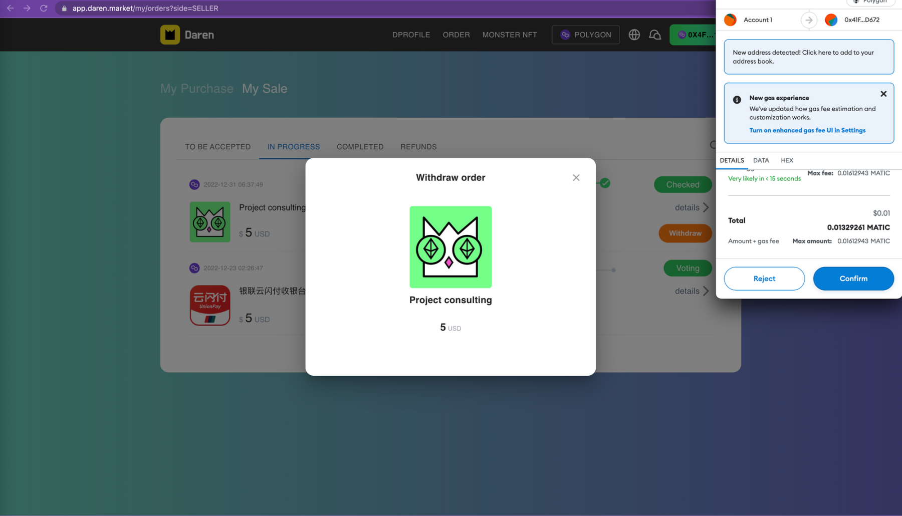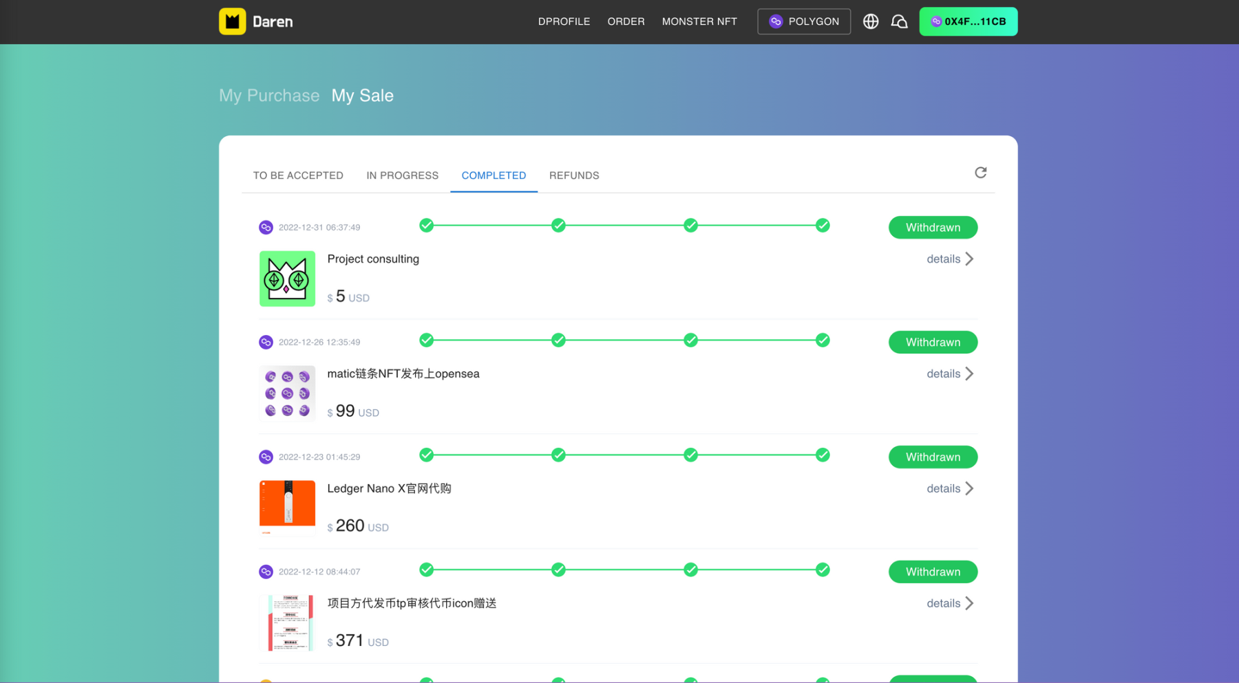 6.【Seller withdraws coins】Click Withdraw and complete Metamask confirmation → you can see the order enter COMPLETED → process completed