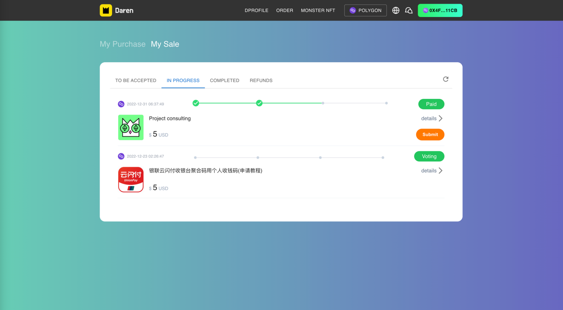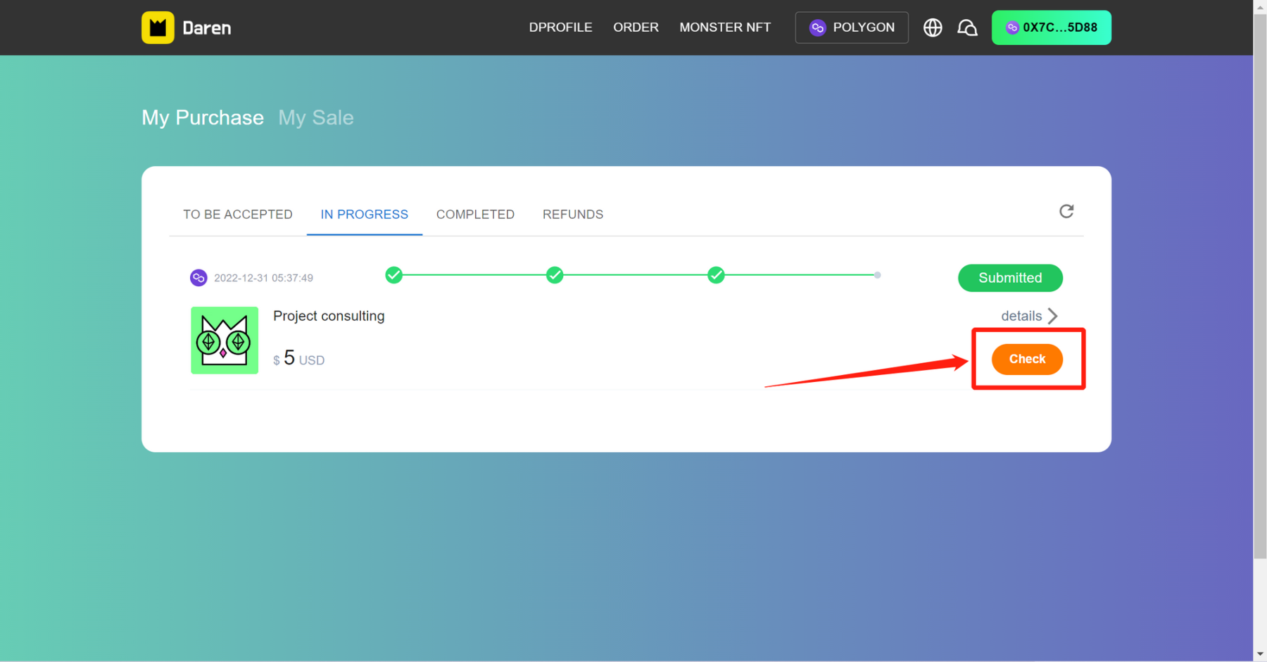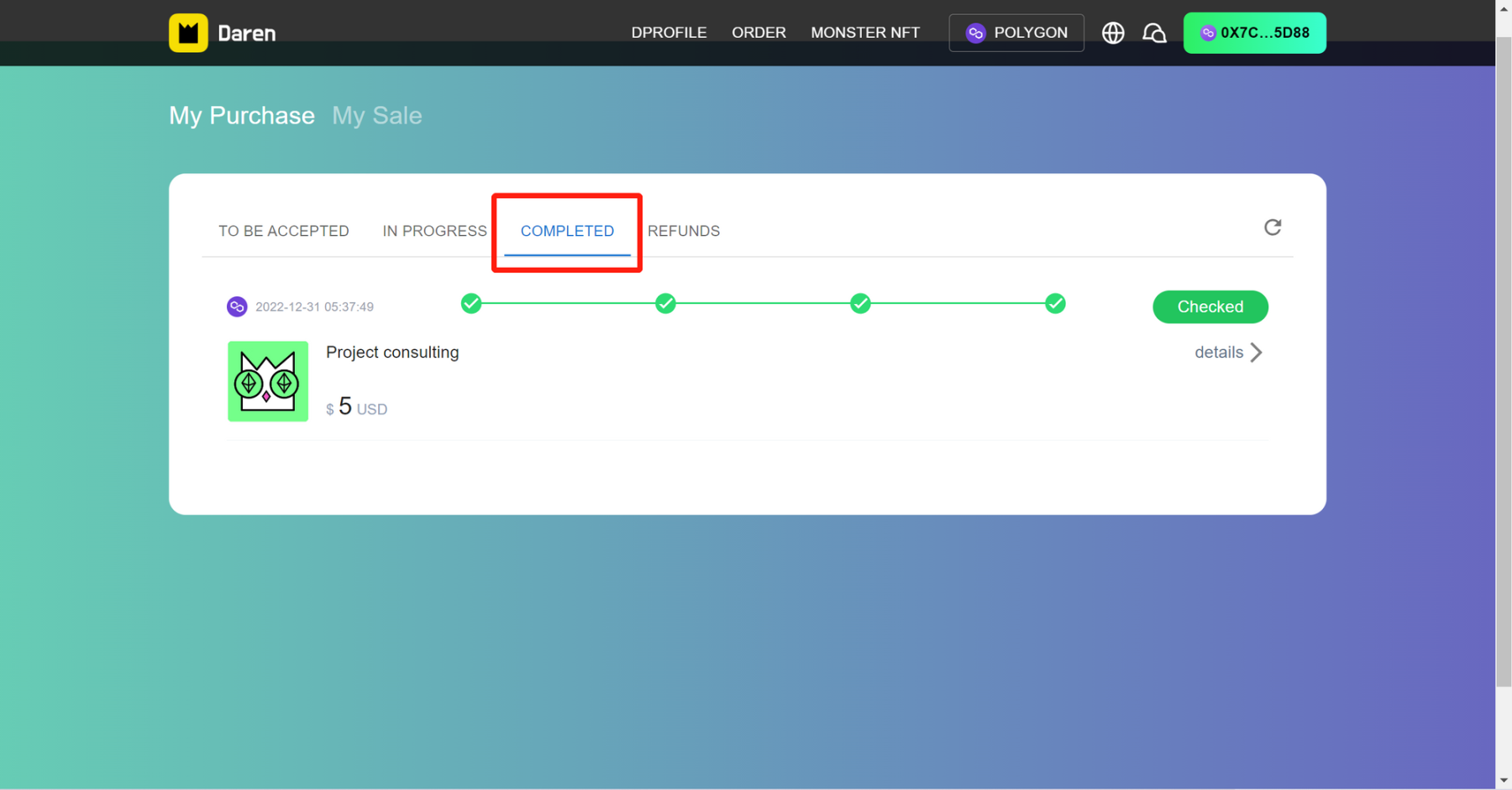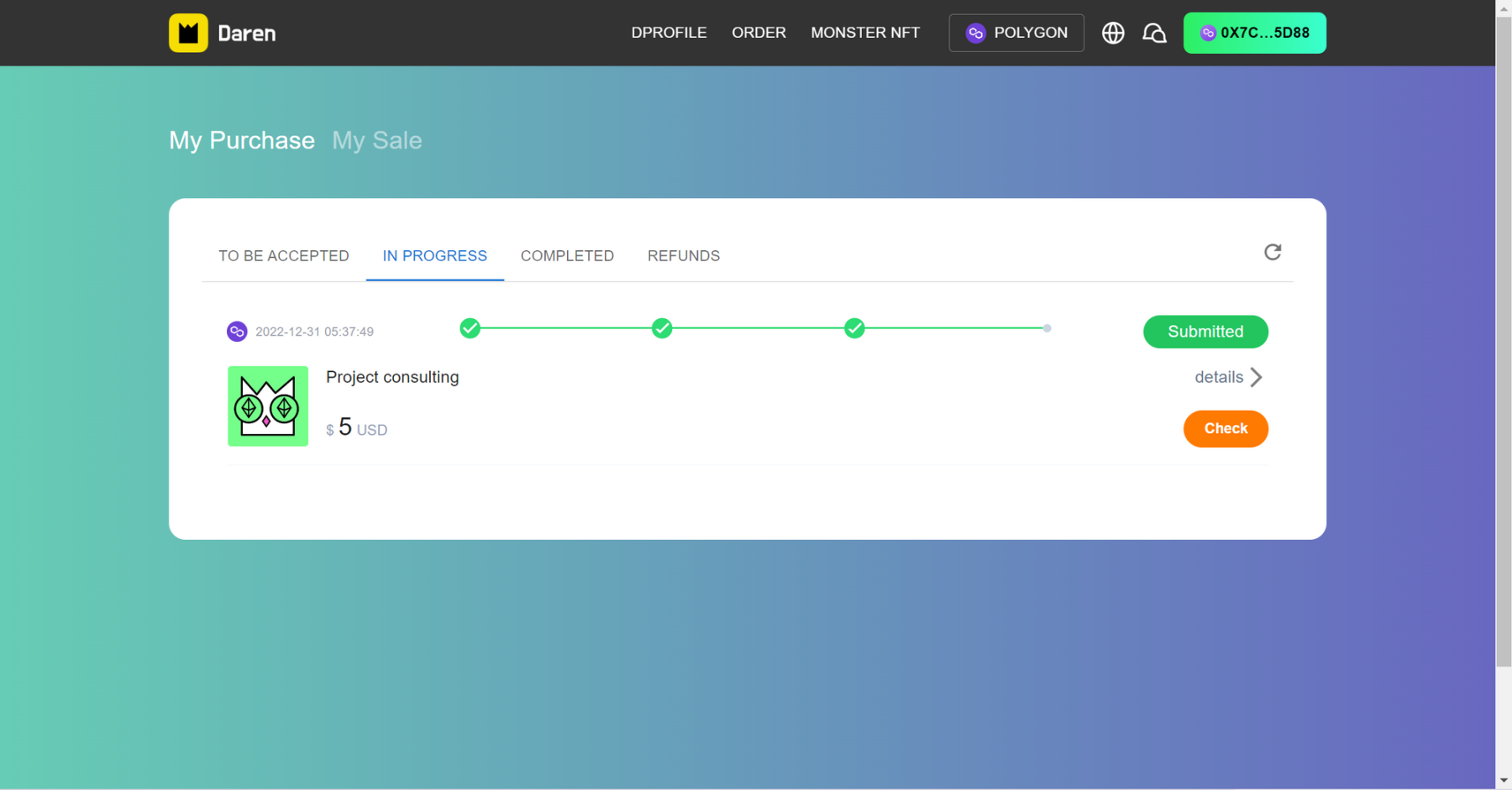 5.【Buyer Confirmation of Acceptance】After refreshing, you can see the order page shows SUBMITTED → Click Check for service acceptance → Metamask Confirms → You can see the order is displayed in COMPLETED