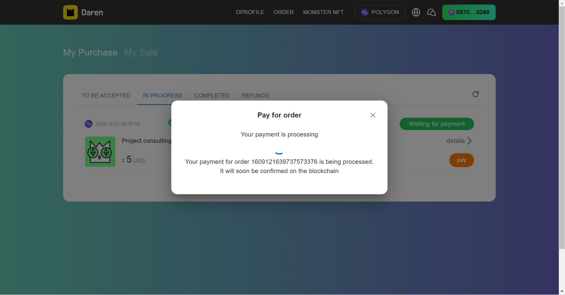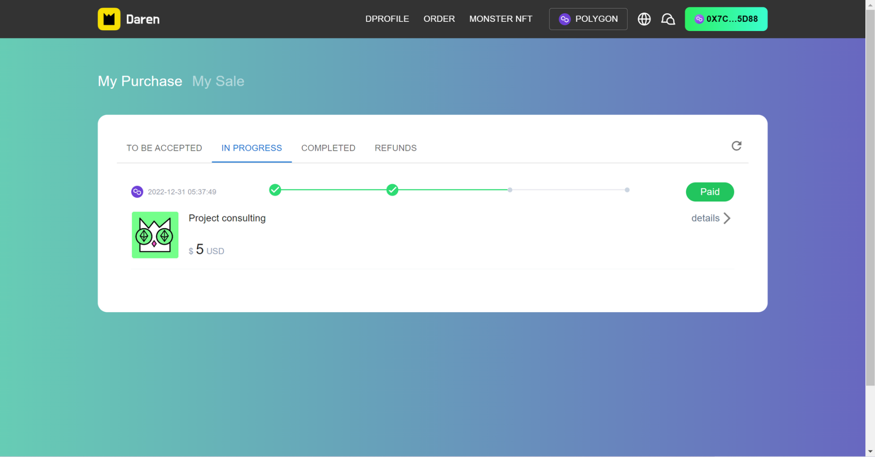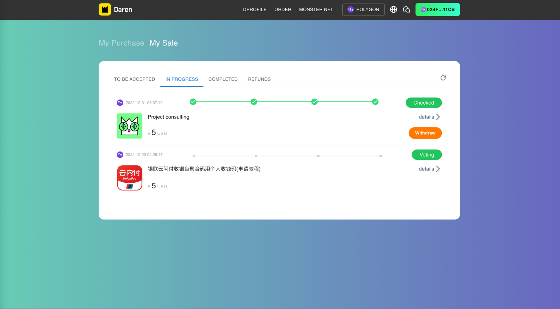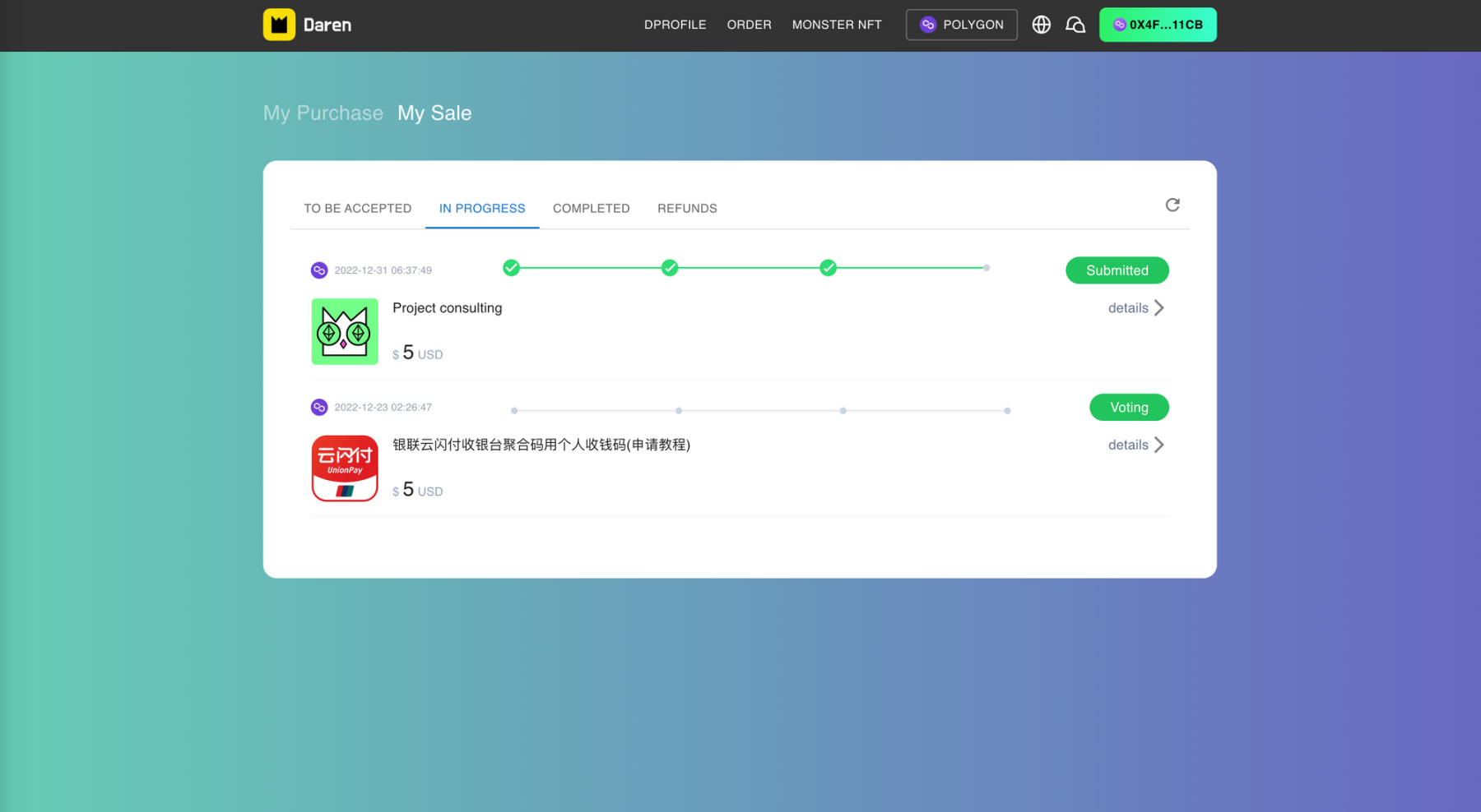 5.【Buyer Confirmation of Acceptance】After refreshing, you can see the order page shows SUBMITTED → Click Check for service acceptance → Metamask Confirms → You can see the order is displayed in COMPLETED