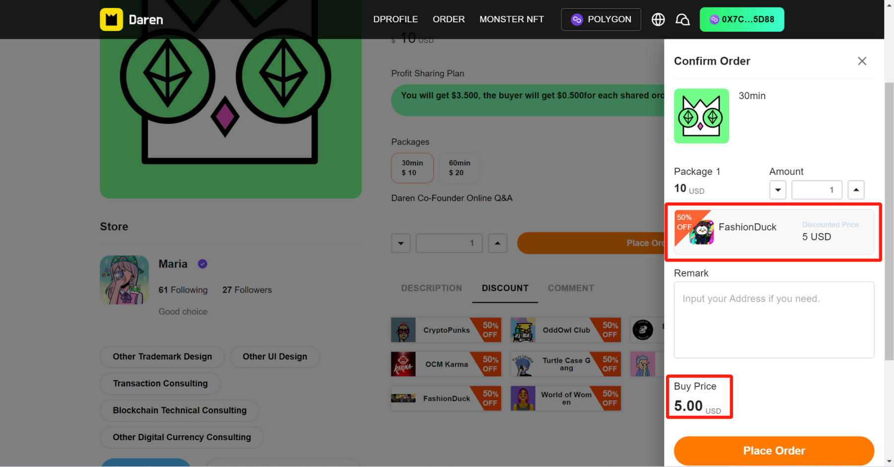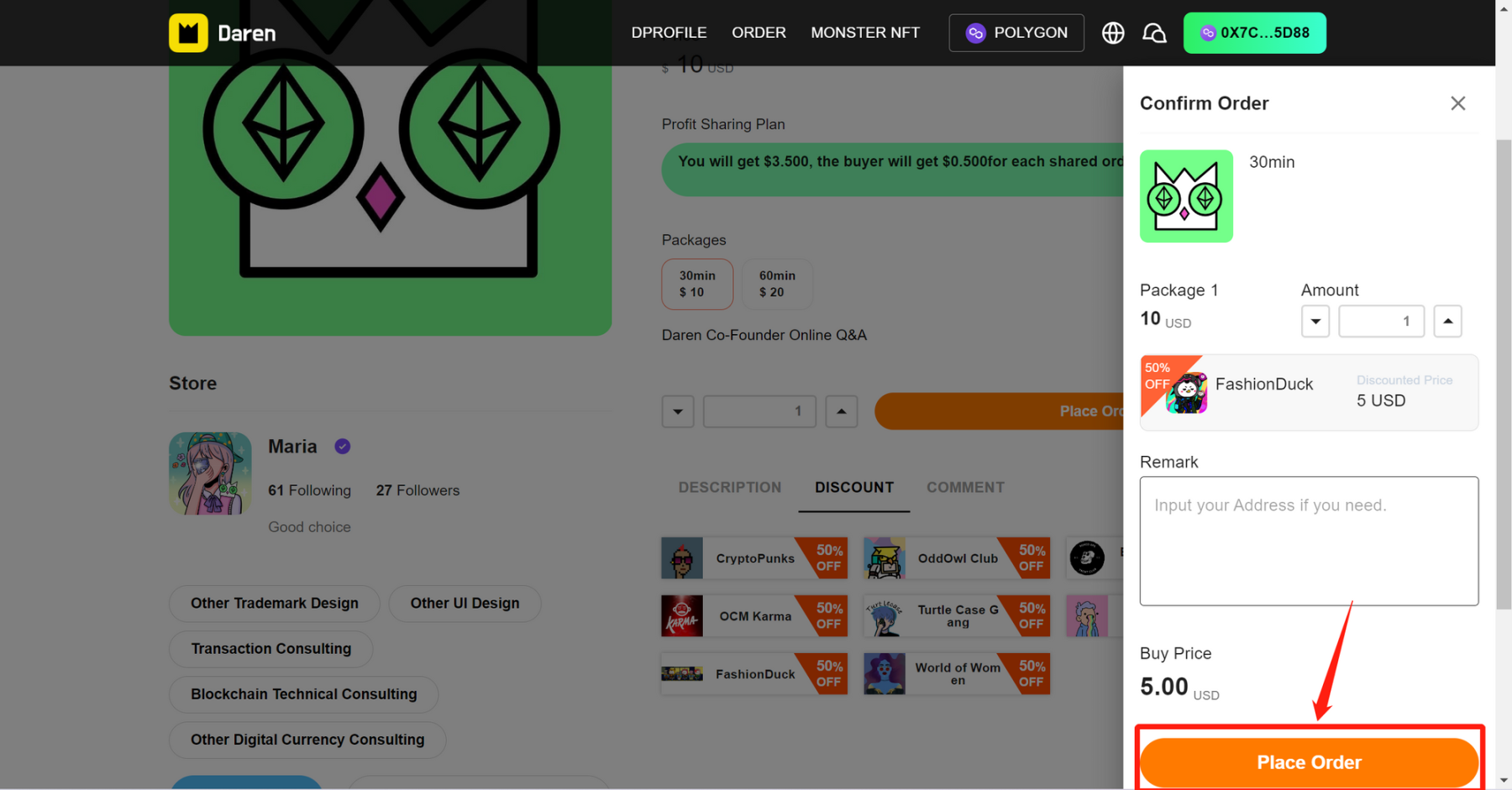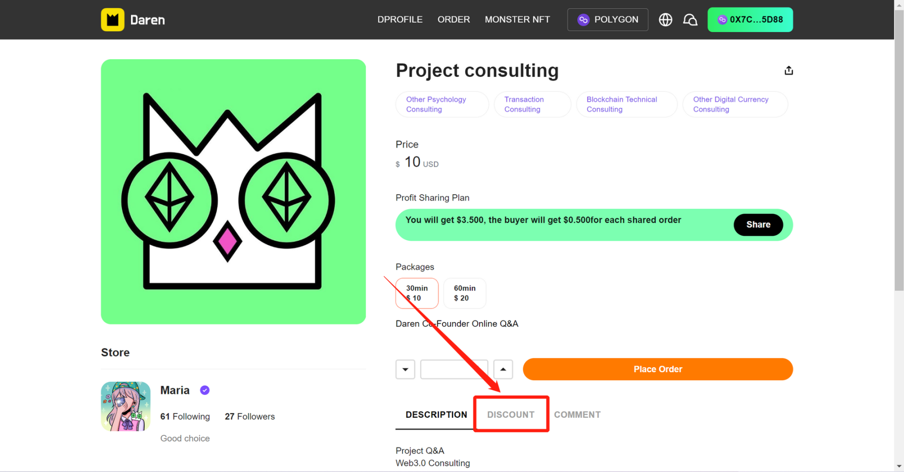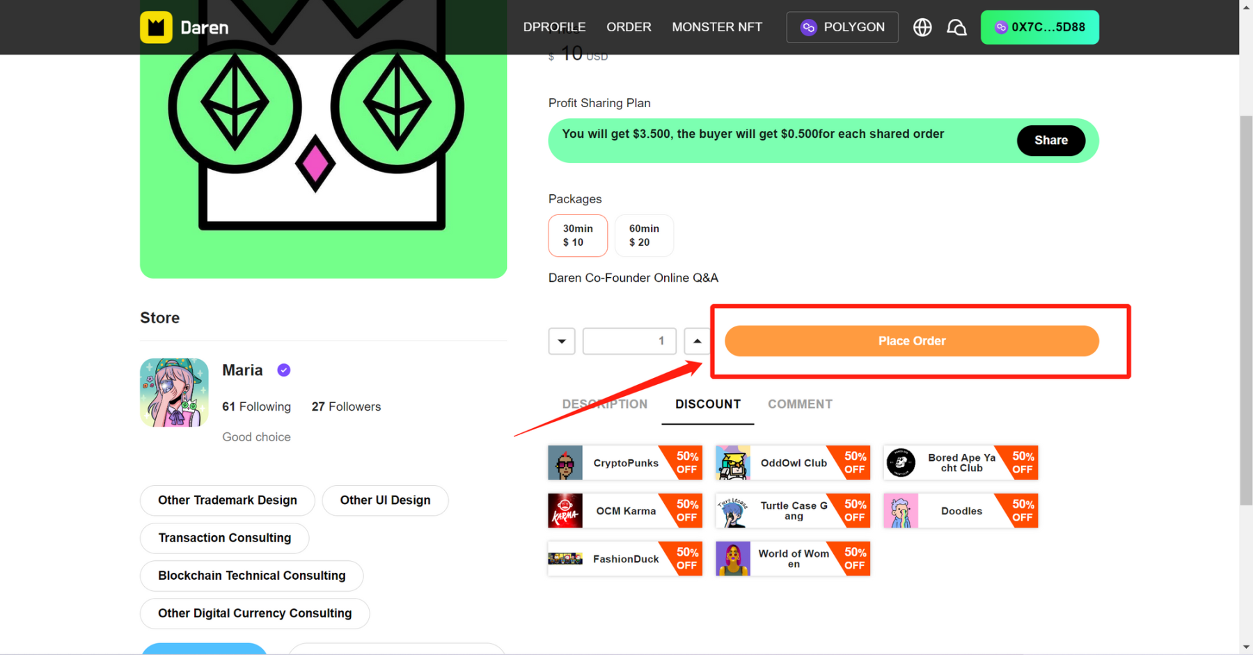 1.【Buyer View Service】Open Service Page→Check if there is NFT in DISCOUNT→Click Place Order