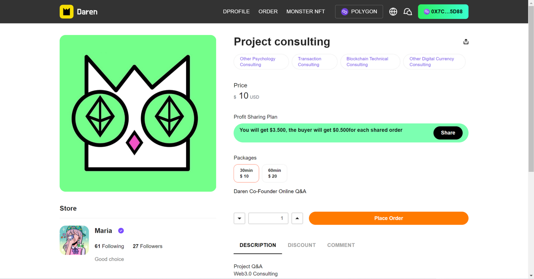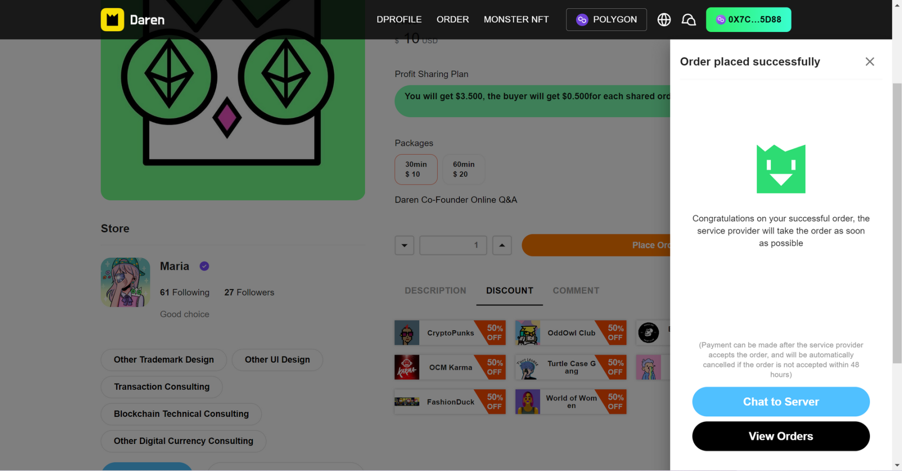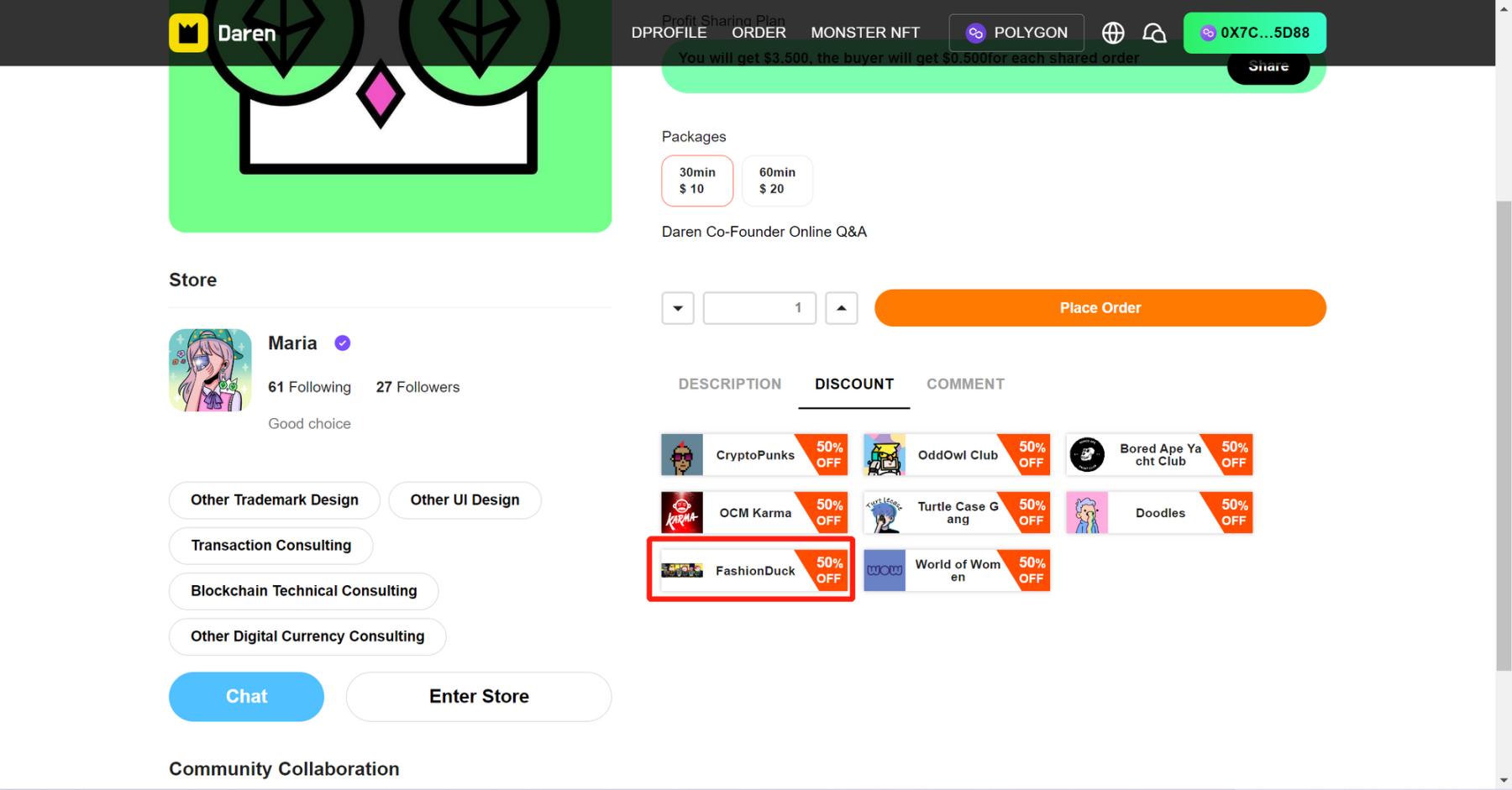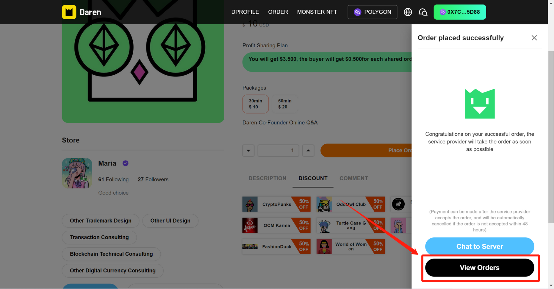 1.【Buyer View Service】Open Service Page→Check if there is NFT in DISCOUNT→Click Place Order