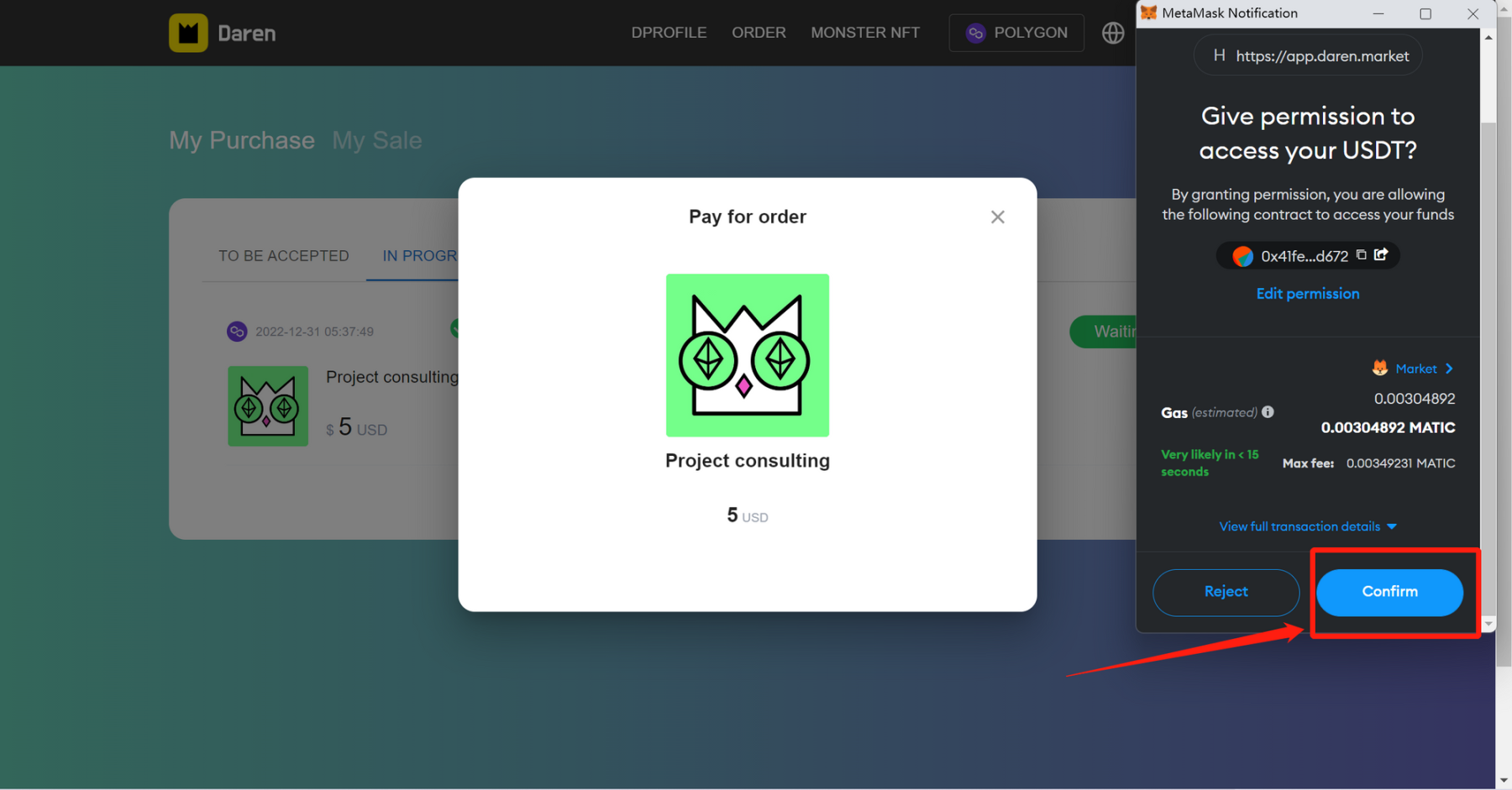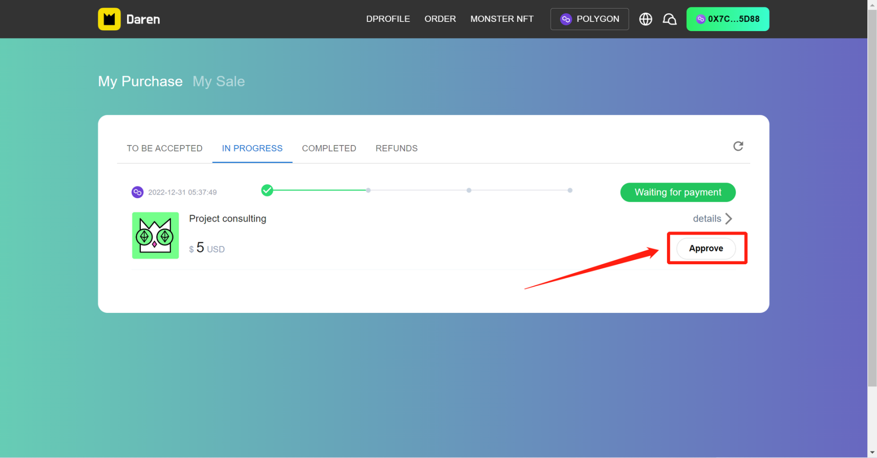 3.【Buyer Payment】Click Approve to authorize the transaction system (only first time) → Metamask to confirm → Click Pay → Order is shown as Paid → (need seller to operate to continue)