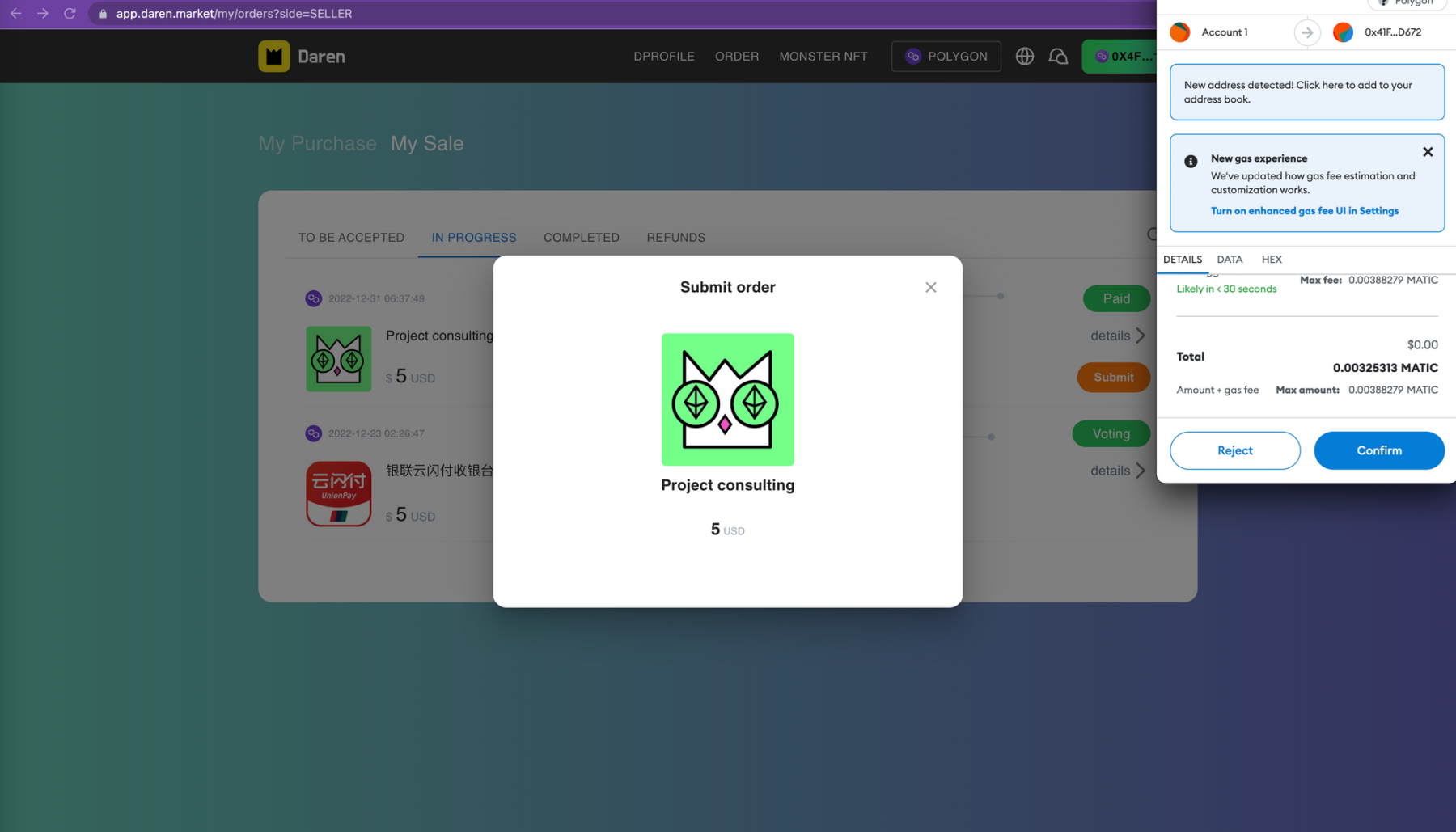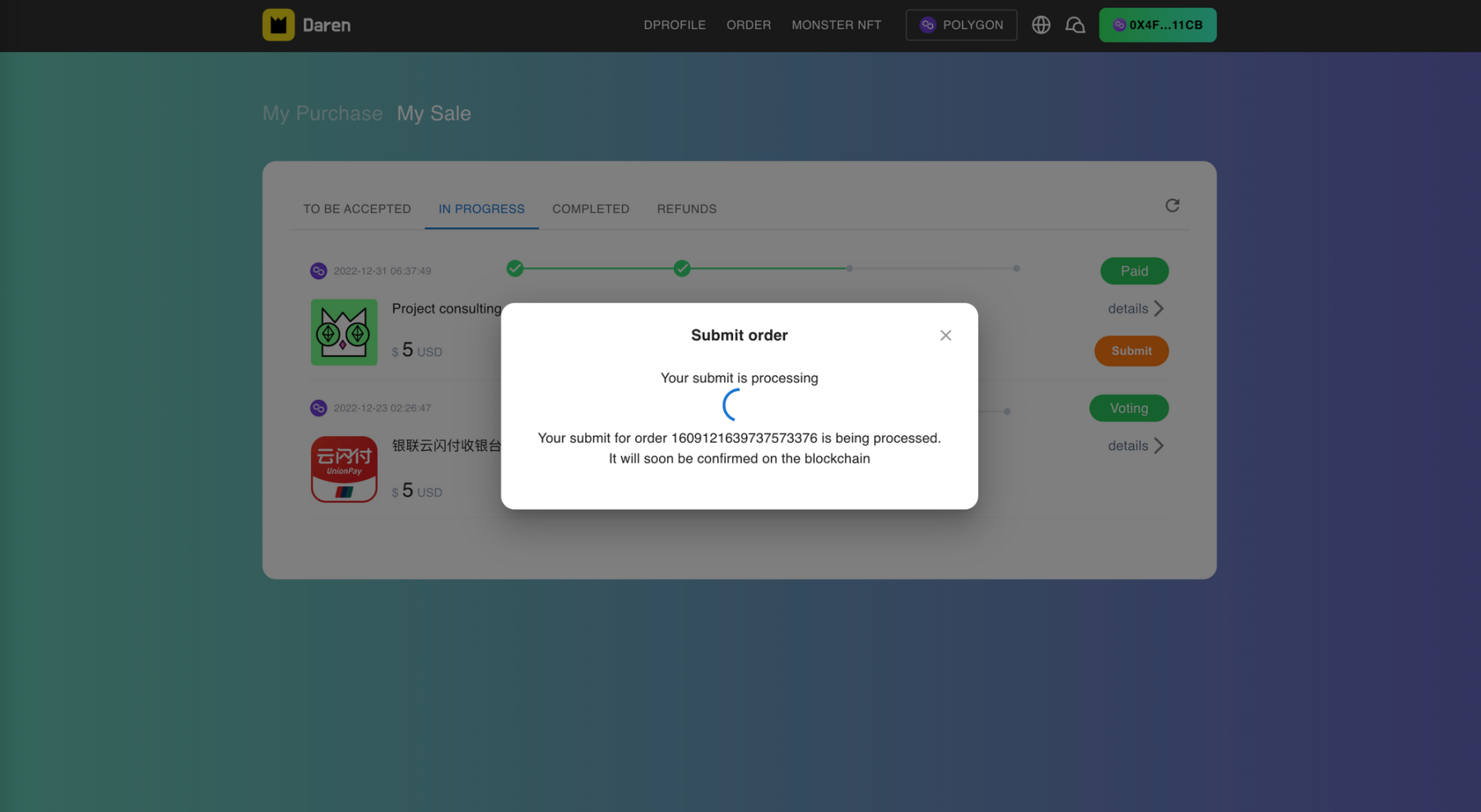 4.【Seller submits service】 Click Submit for service submission → Metamask confirms → Order is shown Submitted → (requires buyer to operate to continue)