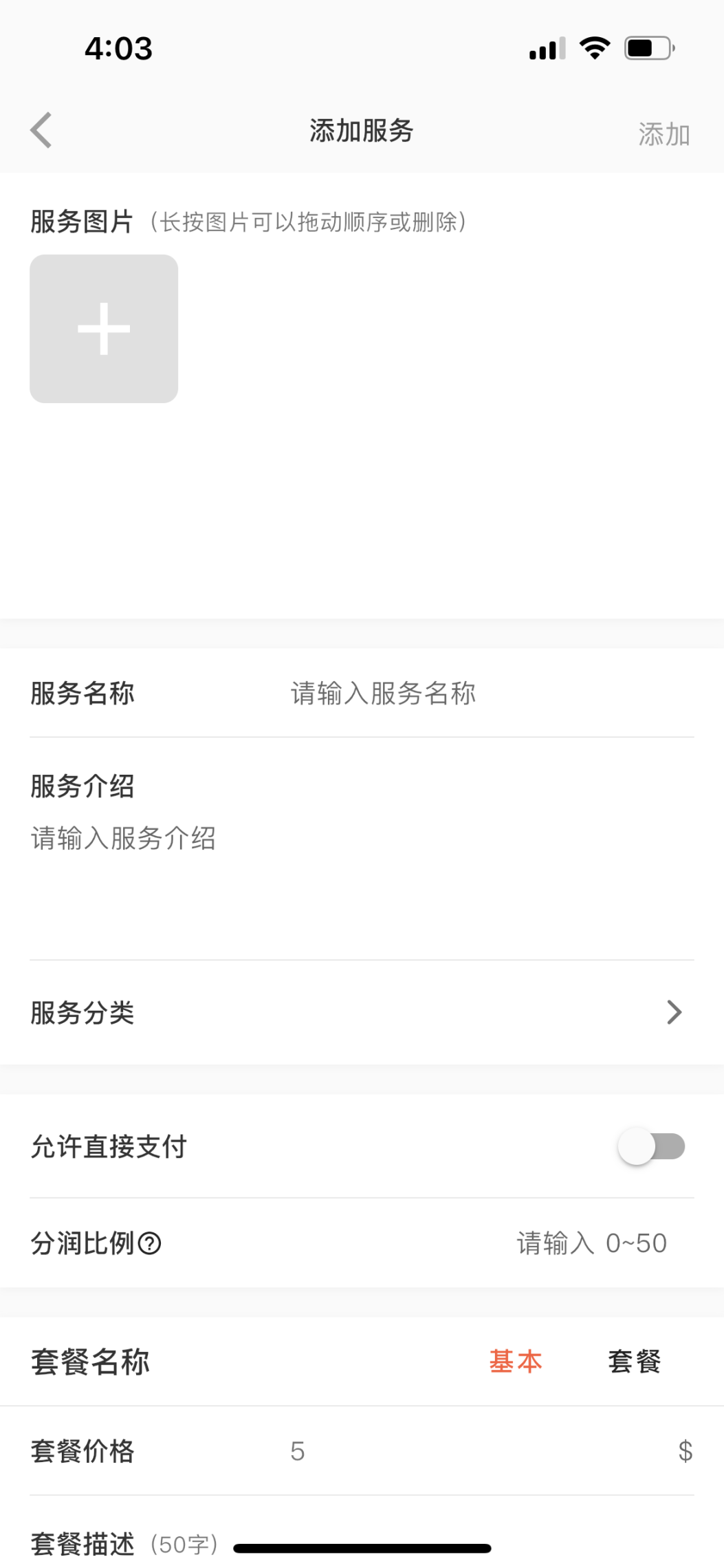 上传图片,填写服务介绍,设置是否可以直接支付,设置分润后 按右上角的【添加】即可完成服务的上架