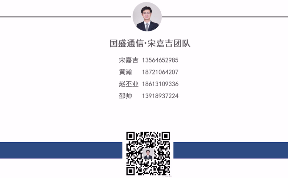 重要声明:本订阅号是国盛证券通信团队设立的。本订阅号不是国盛通信团队研究报告的发布平台。本订阅号所载的信息仅面向专业投资机构,仅供在新媒体背景下研究观点的及时交流。本订阅号所载的信息均摘编自国盛证券研究所已经发布的研究报告或者系对已发布报告的后续解读,若因对报告的摘编而产生歧义,应以报告发布当日的完整内容为准。本资料仅代表报告发布当日的判断,相关的分析意见及推测可在不发出通知的情形下做出更改,读者参考时还须及时跟踪后续最新的研究进展。