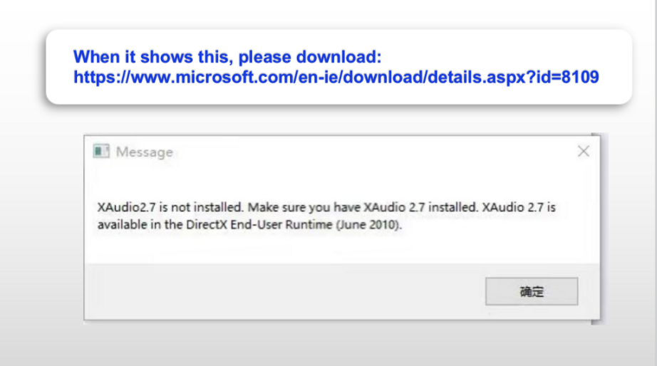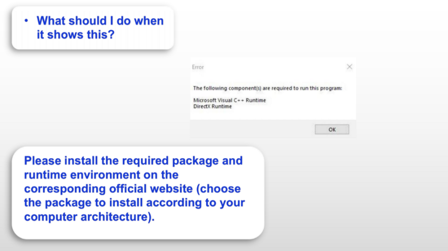 II. Note: If the computer has not installed the environment before, it would alert: “The following components are required to run this program: Microsoft Visual C++ Runtime DirectX Runtime”