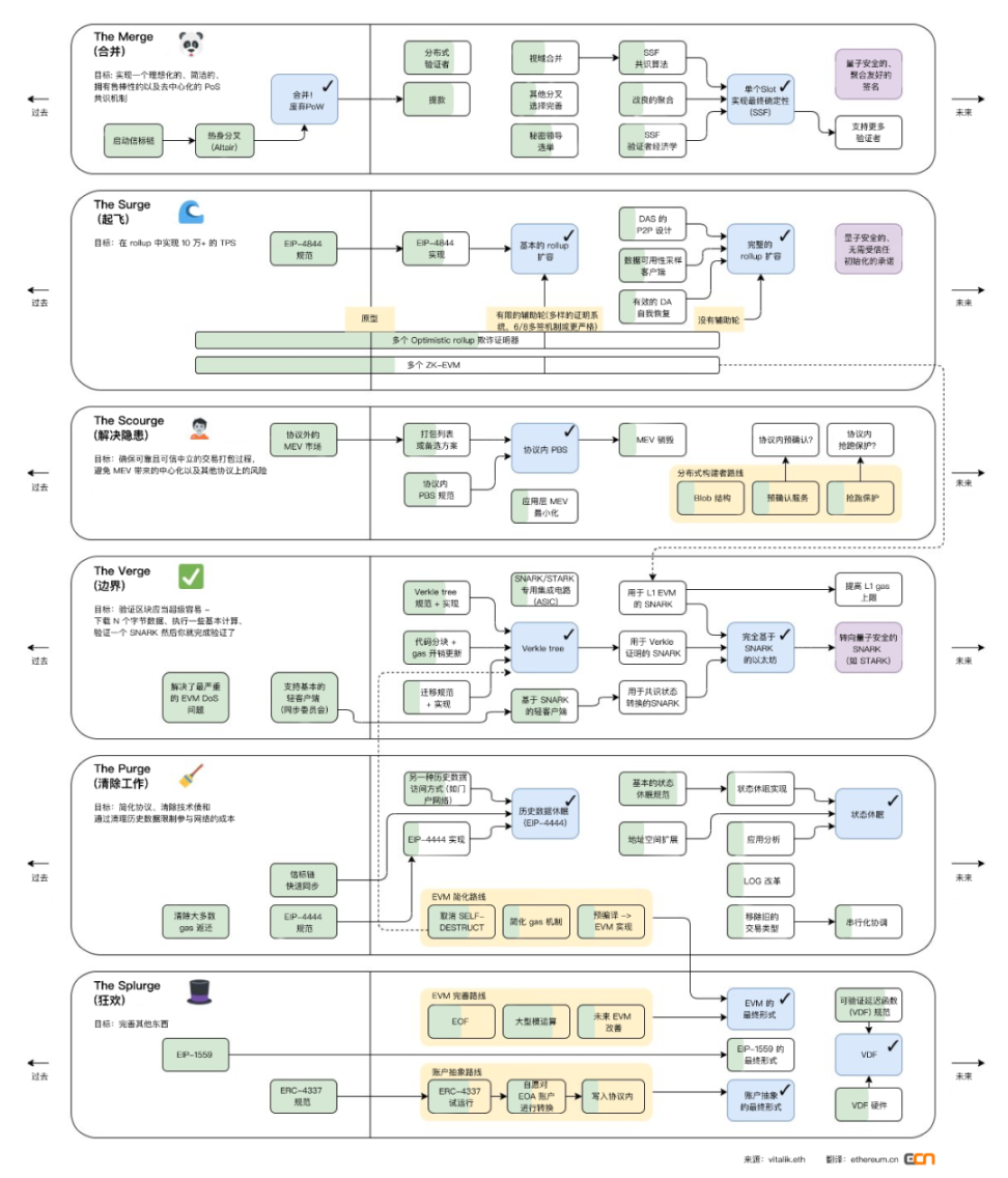 简单地看下 Vitalik 发布的以太坊路线图吧,在协议真正“完成”之前,还有着漫长而复杂的岁月 (5 年?10 年?) ,你会情不自禁地感觉到令人混乱的沉重。我们不能因为合并的交付而骄傲自满,而是应该利用这股势头,和相关的专业性、工具以及程序去解决仍然存在的许多挑战。