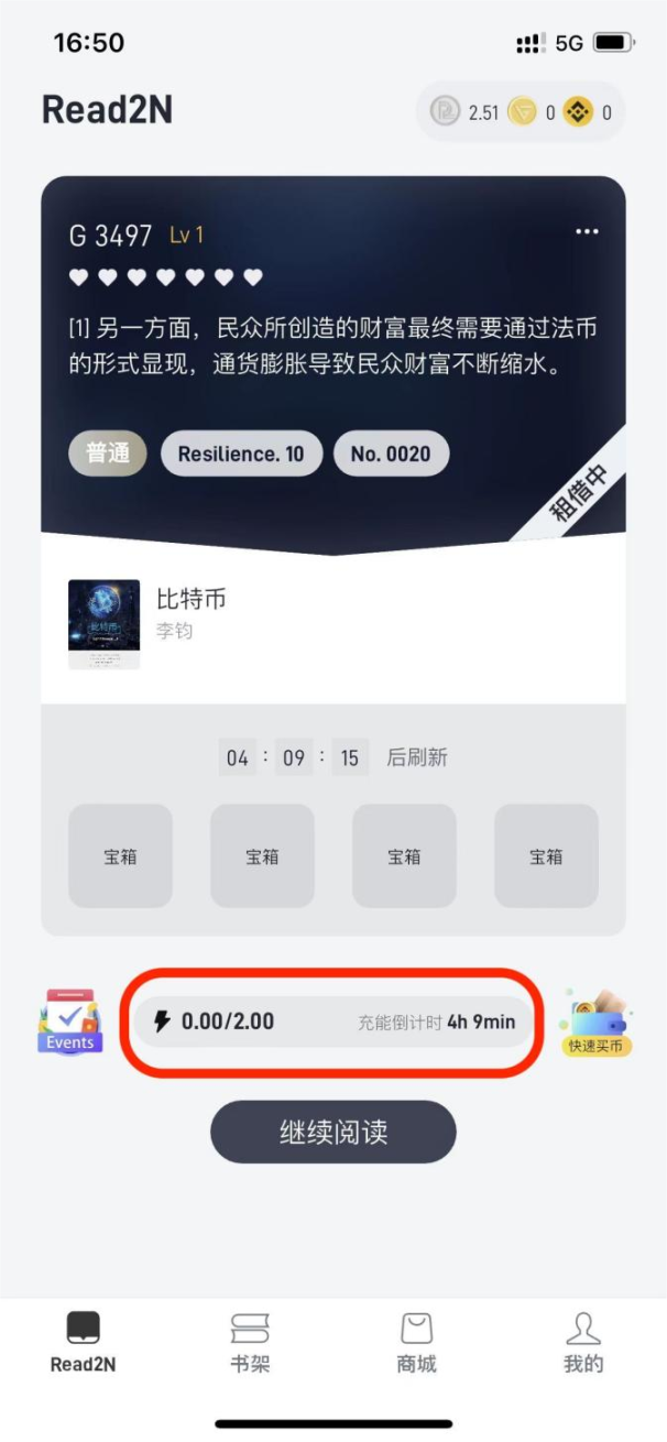 购买或者租赁一本书后,就可以开始阅读。主界面会显示当前的能量值(每 6 小时恢复上限的 25%),和开始阅读 / 继续阅读的按钮。