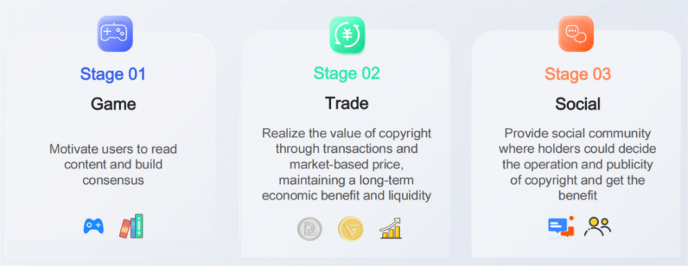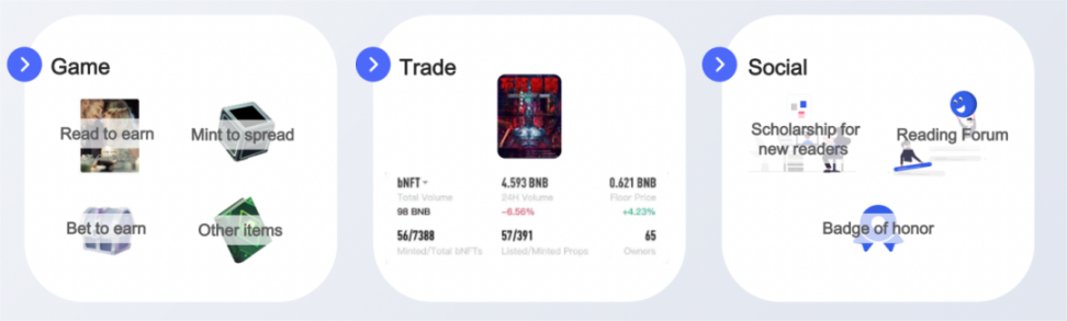 在阅读图书的过程中读者可以获得游戏代币与道具,之后的用户出于需求会向其他用户收购代币与道具用于铸造 NFT。这样读者能实现边阅读边赚钱,以此激励读者凝聚共识、传播作品。