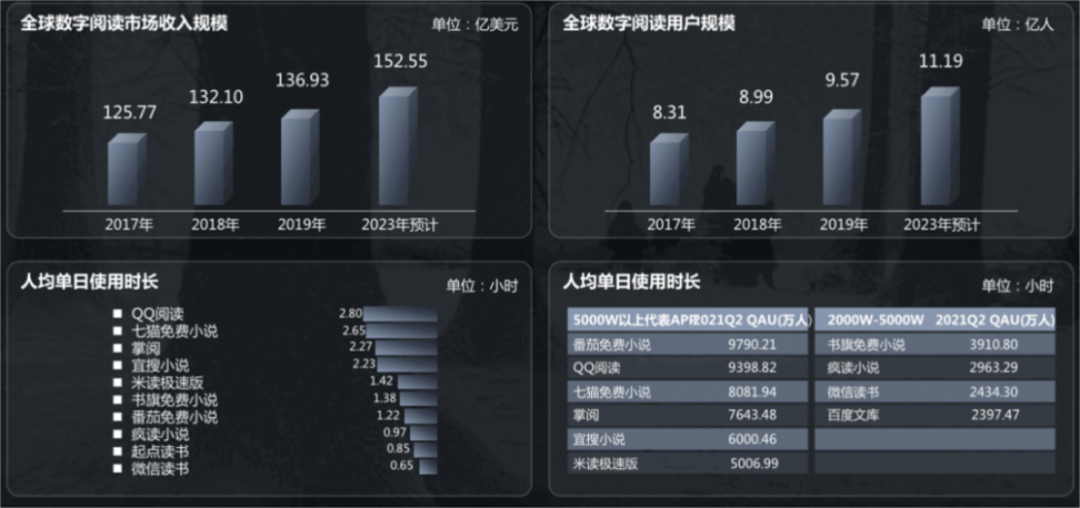随着智能手机、互联网的普及,数字阅读逐渐成为了人们的习惯。2021 年中国的数字阅读用户规模突破 5 亿,数字阅读产业整体营收规模达 415.7 亿元。预计2023 全球数字阅读市场收入规模将增长到 152 亿美元,用户规模预计达 11.19 亿。