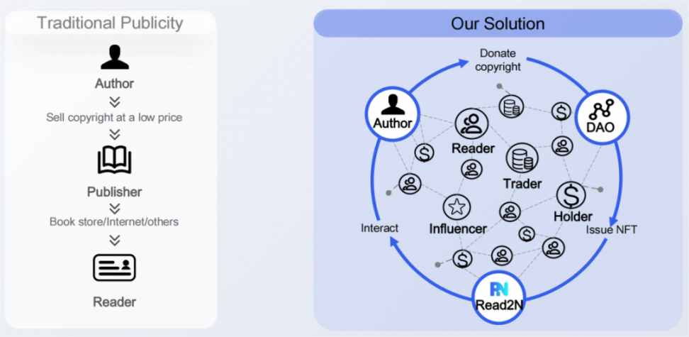 对于创作者而言:作者只能被动等待具备垄断权的出版平台为自己的作品进行宣传。而 Read2N 上只要有一个用户喜欢创作者的作品,这本作品就可以被 Mint 成 NFT,以去中心化的方式由读者以口碑传播的方式主动分发。