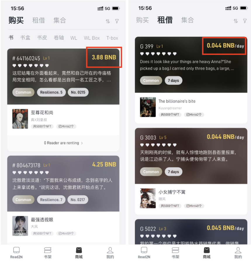 租借图书:点击“商城”——“租借”,进入图书租借市场。图书租借按照 BNB/ 天进行计价,用户可以根据需求选择租借的时长,并一次性支付租借所需费用。目前最低 0.044BNB 一天,最长可租 14 天。