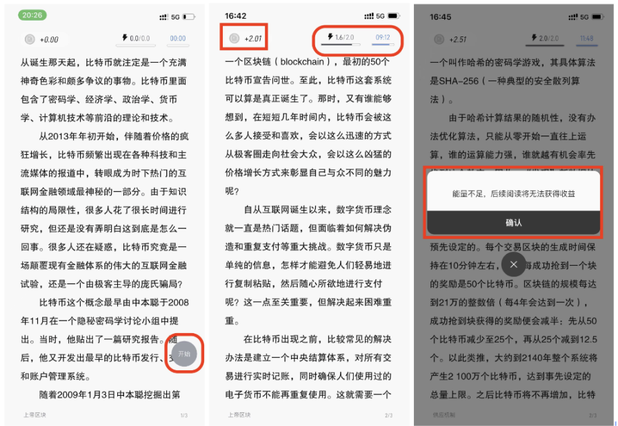 在“Read2N”首页进行开始阅读。标红部分为能量值点进“开始阅读”后,即可开始看书。如果需要消耗能量来 Read to Earn,需要点击下方开始按钮,会看到上方三个数值分别代表“此次阅读获得的代币”、“消耗了多少能量”、“阅读了多少时间”。能量不足会触发提醒,能量耗尽的话在后续的阅读中无法获得收益。