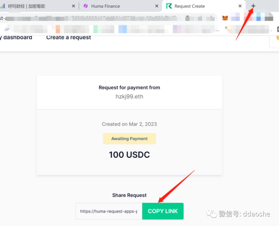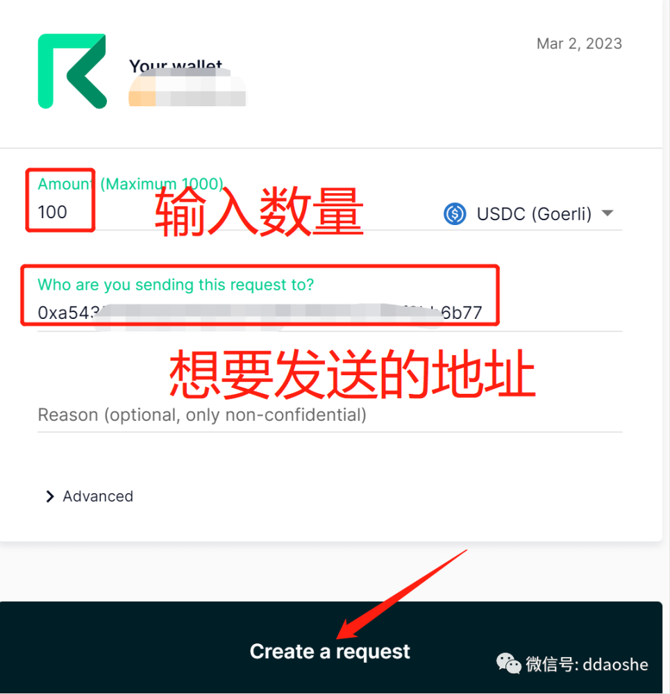 9 输入要发送 token 的数量以及钱包地址,点击 Create a request