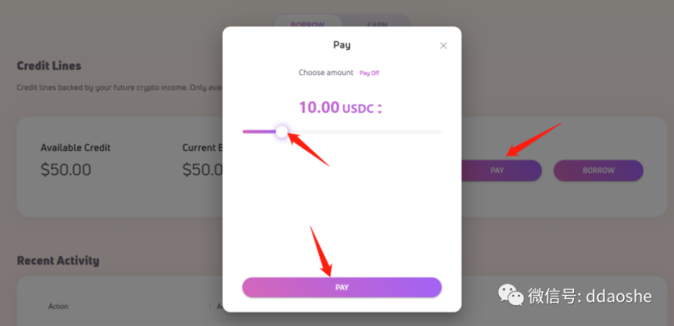 6 体验 pay,点击 pay 按钮,输入要还的数量,确定即可
