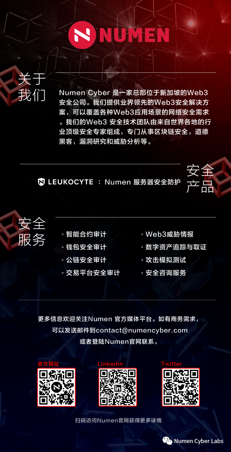 Numen Cyber 通过对智能合约、公链、钱包、交易平台安全审计,链上合约威胁检测和响应、Web3 安全态势感知、数字货币追踪和 Web3 威胁情报等服务和产品增强 Web 3 项目在整个开发周期各个阶段的安全能力,保障项目方和用户的数字资产安全。更多信息,请访问:https://www.numencyber.com/