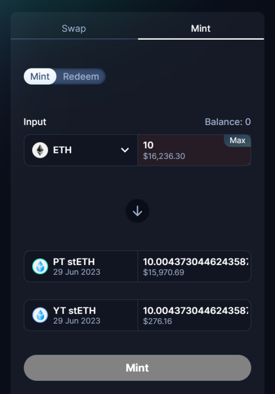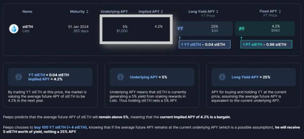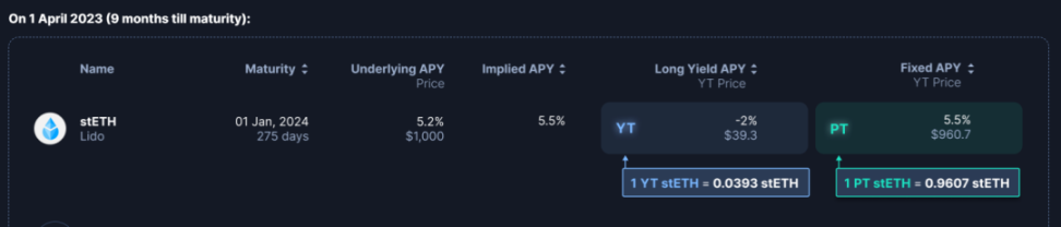 如果此时花 4stETH 购买 100 份收益代币,那么期限结束就可以白赚一枚 stETH,价值 1 枚 ETH。如果情况刚好相反,则可以购买本金代币,实现稳定收益。
