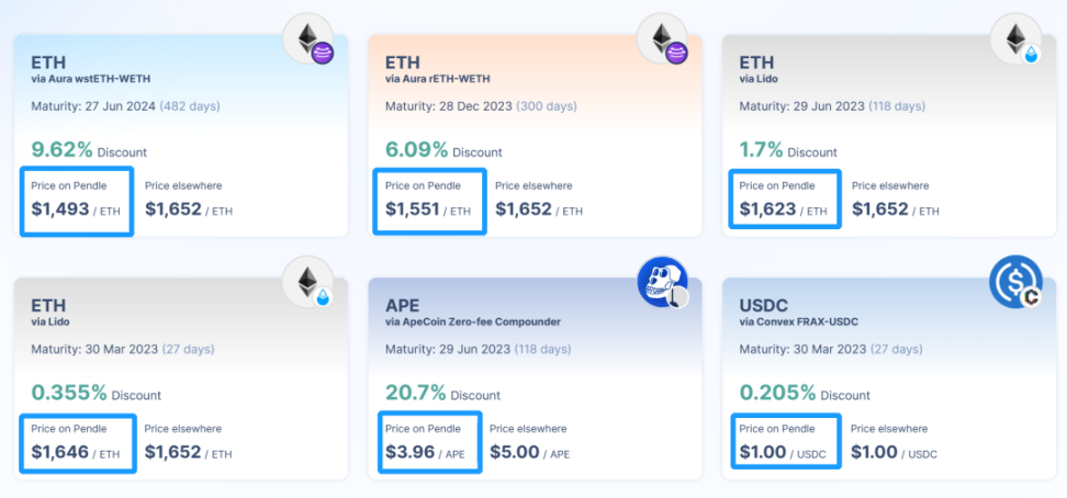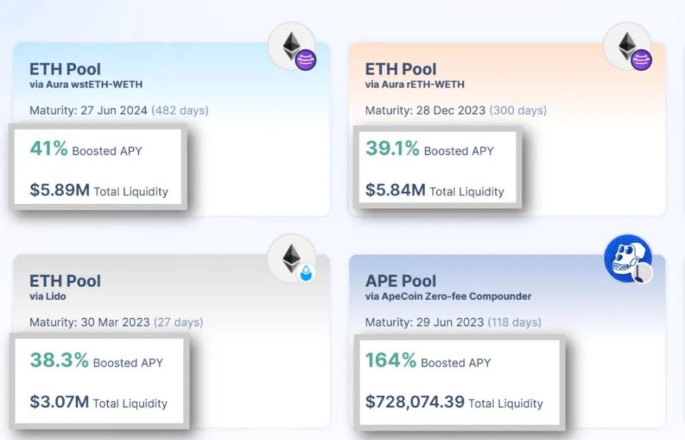 也由于市场会以这种方式不断提供资产流动性,用户也可以以低于市场价的价格买下别人卖出的收益代币和本金代币。比如以最高九折购买 ETH 资产,以最高八折购买 APE 资产等。
