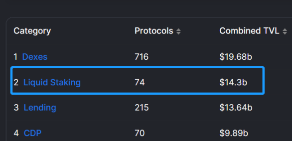据 DeFillama 数据显示,如今流动性质押板块的 TVL 已经达到 143 亿美元,仅次于去中心化交易所,成为 DeFi 世界的第二大板块。