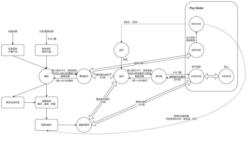 整个资源交换链条中,金币、黑铁、Drone、Dogma、Wemix 稳定币被频繁使用,项目方除了可以获得用户氪金直接收入外,还可以获取各个环节中的交易手续费。