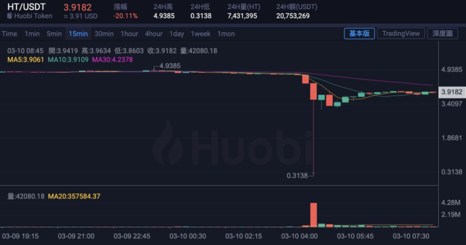 在主流币全面走跌的背景下,有一个排名前 100 的币种「插针状况」特别严重,那就是火必交易所的平台币 HT。据官方数据显示,HT 一度在今晨五点左右,插针来到 0.3138 美元,10 分钟内价值蒸发超 99%!