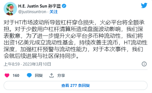 并于随后进一步表示:这次 HT 市场波动导致爆仓的损失,火必将全额承担。同时为了进一步提升杠杆预警与代币流动性,该平台还预计将出资 1 亿美元成立流动性基金,持续改善主流币和 HT 市场深度、承诺后续更新状况将持续和社群同步。