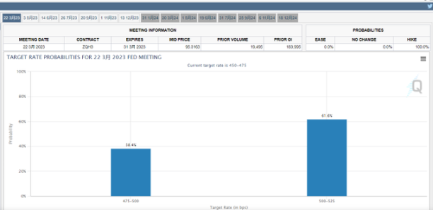 3 月加息 50 个基点的概率为 61.6%,假如美联储果然在 3 月 27 加息 50 个基点的话,也就意味着还有 38.4% 的加息概率没有被计入价内