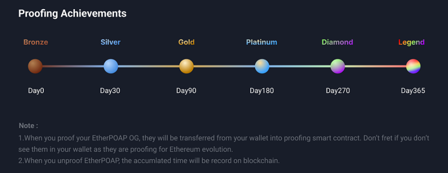 Based on the ‘POINT’ release mechanism design, the ‘POINT’ volume releases for the first year since the time that the beginning date as Day-0 (EtherPOAP ‘POINT’ Function Launches Day) of OG ‘Proofing’ would be 100,000 in total. The volume of ‘POINT’ releases from Day-0 to Day-15 is 1,000/Day. Every subsequent 15 days, the ‘POINT’ release volume per day should be reduced as: 15,000*(1/1.2^n)/15 (n=0, 1, 2, …, n).