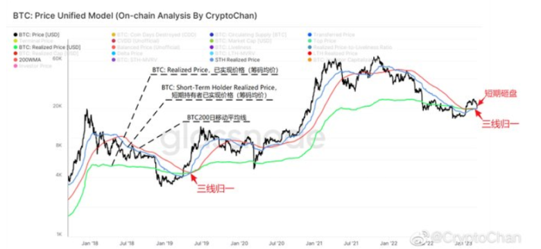 未来,比特币行情将如何发展?这或许仍然是目前市场普遍关注的一个问题。我们此前曾在《比特币 2022 年度回顾及趋势展望》分析过,本文认为这仍然是值得借鉴的。其核心内容如下:从长期来看,美联储本轮的降息周期或将于比特币的减半周期重合,有望在内外两重影响因素刺激下走向大牛。由 Jan Hatzius 领导的高盛分析团队认为,美联储预计在 2023 年加息一次,然后将利率维持在 4.25% 至 4.50% 的范围内,直到 2024 年。随后,预计美联储将在 2024 年降息一次。如果高盛分析师的预测与美联储政策差不太多,那么 2024 年比特币减半时的大牛市还是可期。比特币下一次减半预计发生在 2024 年 4 月 20 日,如果历史重演,根据 Plan B 的数据模型计算,那么在下一个减半之前比特币将涨到 3.6 万美元,之后涨到 14.9 万美元。对于短期行情,有些推特大 V 似乎也表达出乐观情绪。加密大 V CryptoChan(@0xCryptoChan)从链上数据的维度表示:三线归一,小牛升起。短期砸盘无法撼动牛回大趋势。