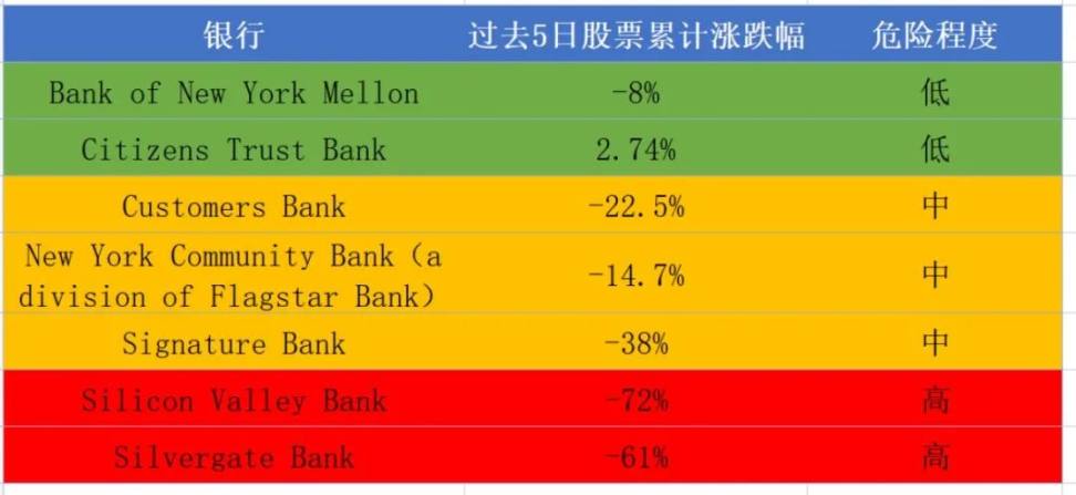 虽然我们目前无法 100% 确定其它银行是否安全,但从股票信息中可以获取一点信息,可以看出,除了 SVB 和 Silvergate 以外,Signatures Bank 等三家银行同样不能让我们放心。