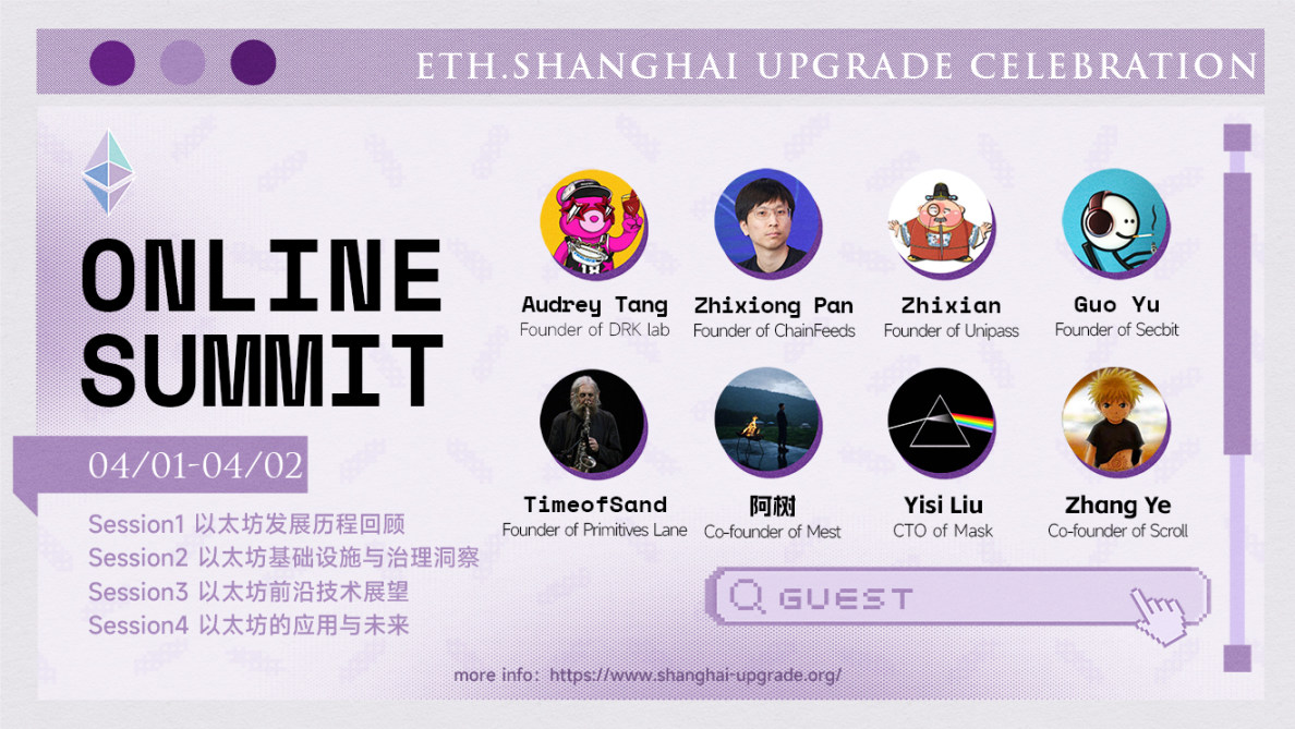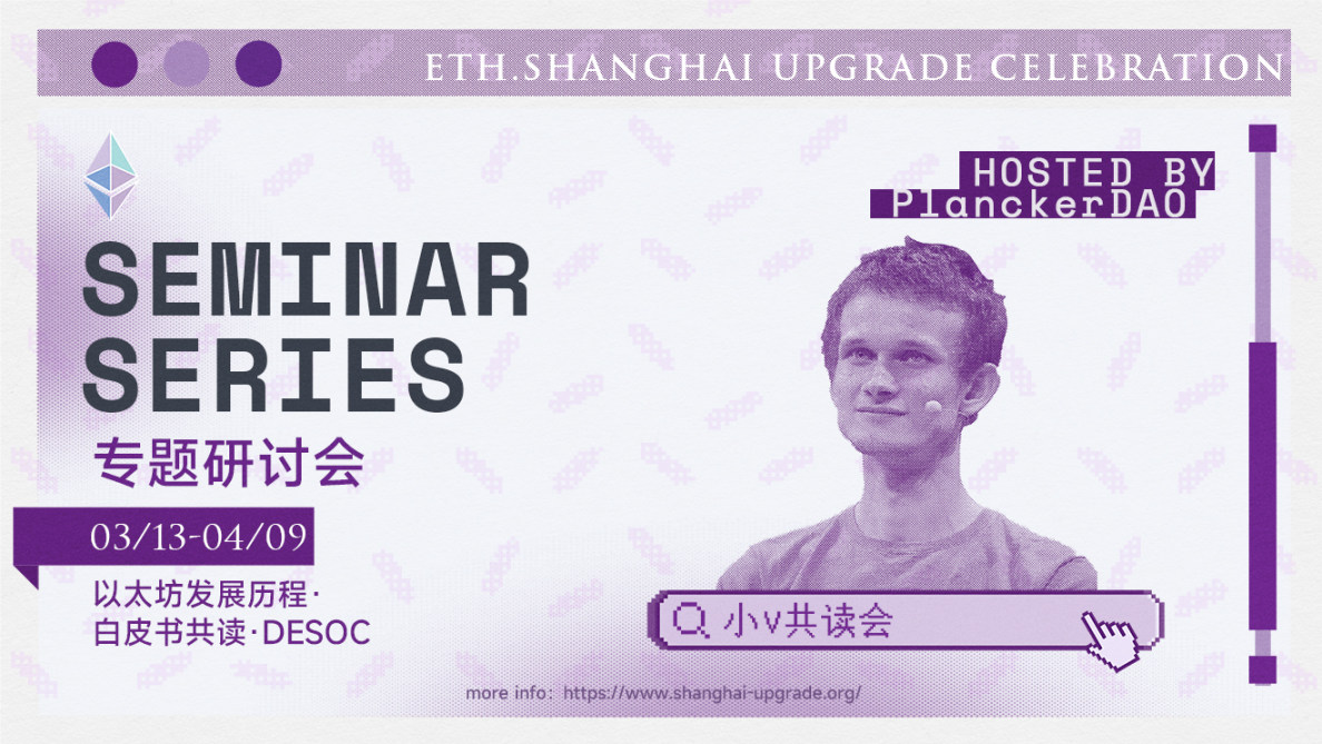 在以太坊“上海”升级之际,我们希望组织一系列活动,帮助更多人了解以太坊的起源和发展,以太坊白皮书的愿景,回顾以太坊在中国的历程以及华人建设者们所做出的努力,学习 Web3.0 的前沿趋势。