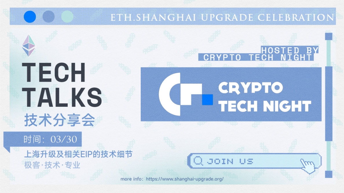 Crypto Tech Night,与资深技术嘉宾一起,探讨以太坊上海升级的更新内容,及相关以太坊实现标准的迭代过程。