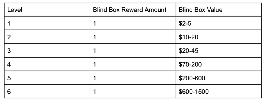 2/ We will take a snapshot every Monday and Friday at 0:00 UTC+4 to record the change of each user’s level. Every time you upgrade to a high level, a NFT blind box with different rewards will be obtained. The higher level you upgrade to, the more NFT blind box rewards you will obtain. The details are as follows: