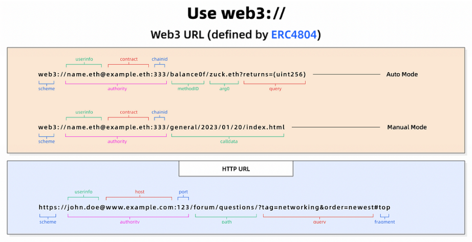 ERC-4804,全名为 EVM 调用信息解译的 Web3 URL,它是一个 HTTP 风格的 Web3 URL (web3://) 到 EVM 的信息调用。