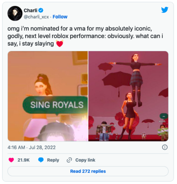 包括 Roblox 和 Fortnite 在内的一些热门游戏平台也紧跟潮流,定期举办音乐会。2022 年 6 月 17 日,英国创作型女歌手 Charli XCX 在 Roblox 举办了一场音乐会。Charli XCX 原名夏洛特·艾玛·艾奇逊(Charlotte Emma Aitchison),1992 年 8 月 2 日出生于英国剑桥,代表作有《Boom Clap》等。