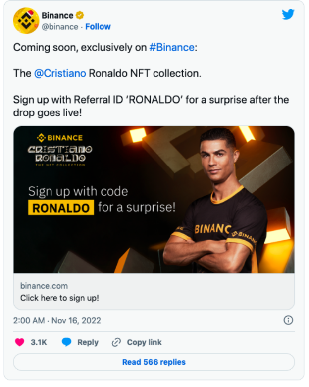 此外,C 罗在 2022 年也与加密交易所 Binance 进行了合作,并在 Binance 的 NFT 市场上推出自己的 NFT 系列。
