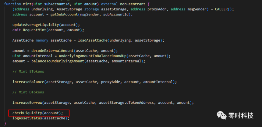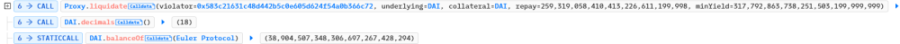 此时攻击者地址共有 400,000,000 dDAI 和 300,930,610 eDAI,已经达到清算条件,由于此函数中缺少清算判断,未能执行清算。