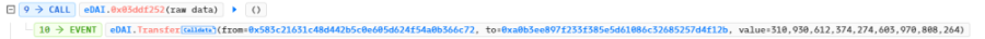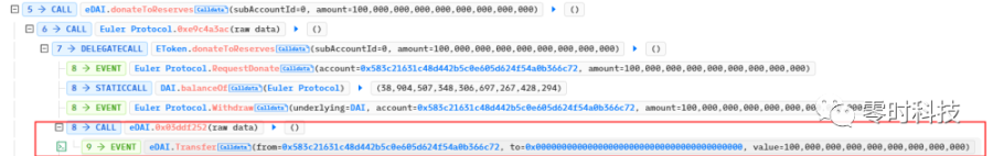 攻击者调用合约中 donateToReserves 函数进行转账,将 100,000,000 eDAI 转移至 0 地址。