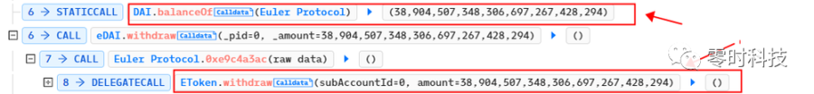 之后攻击者调用 repay 函数继续进行质押,将剩余 10,000,000 DAI 进行质押并销毁 10,000,000 eDAI,之后继续调用 mint 函数借出 200,000,000 dDAI 和 195,681,243eDAI,此时攻击者共有 400,000,000 dDAI 和 400,930,610 eDAI。