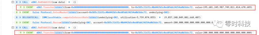 借款合约通过闪电贷借出 30,000,000 DAI,之后将 20,000,000 DAI 存入 Euler 中获得 19,568,124 eDAI,之后调用 mint 函数借出 200,000,000 dDAI 和 195,681,243eDAI,将资产放大 10 倍。
