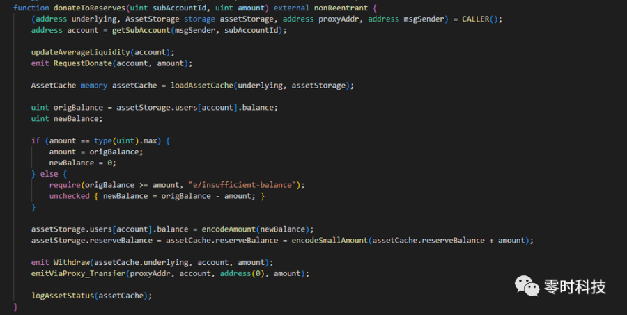 由于函数 donateToReserves 中缺少检查清算逻辑,攻击者可以通过此函数将借款调整为清算状态。